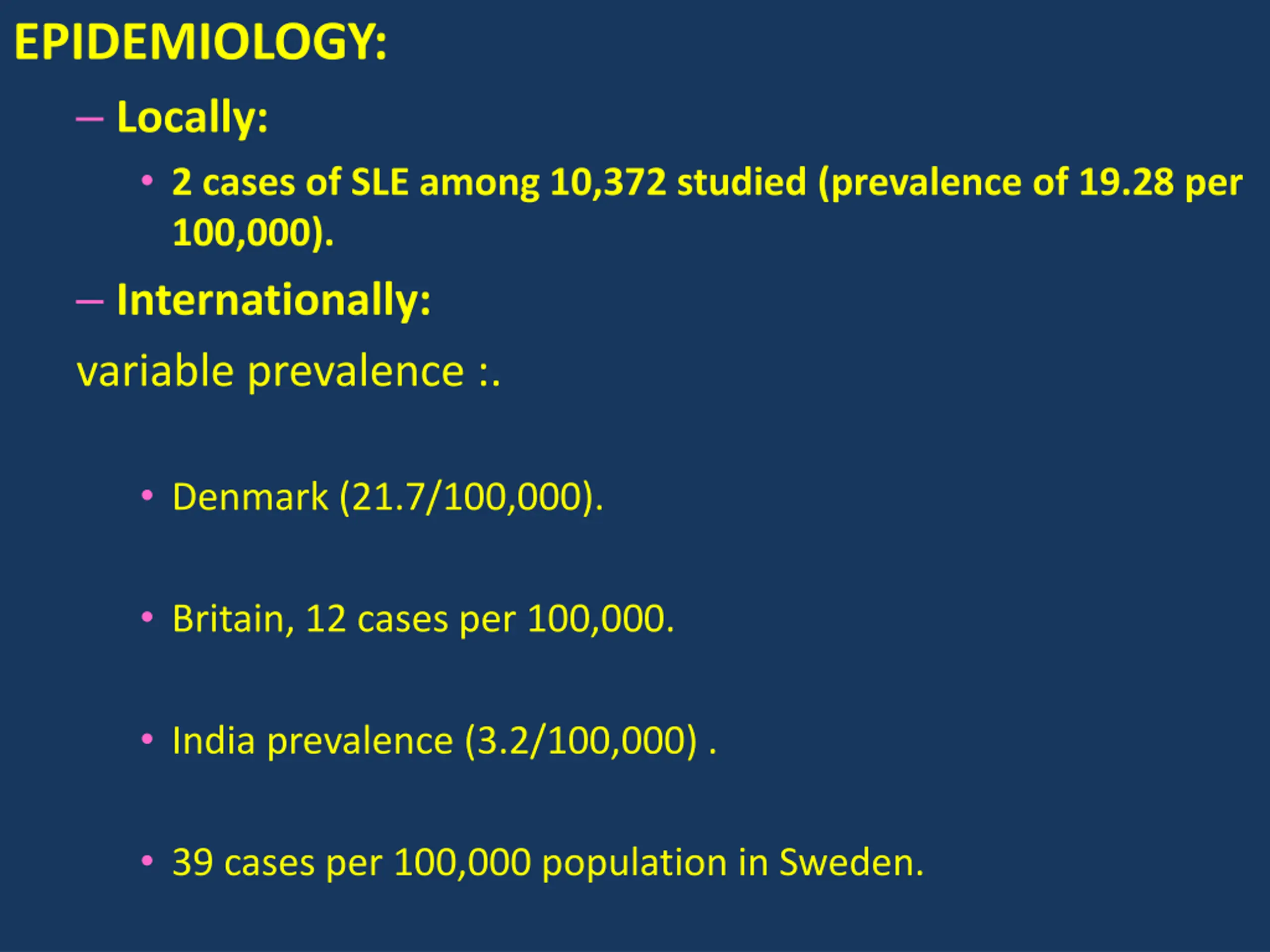 EPIDEMIOLOGY: Locally: 2 cases of SLE among 10,372 studied (prevalence of 19.28 per 100,000). Internationally: variable prevalence :. Denmark (21.7/100,000). Britain, 12 cases per 100,000. India prevalence (3.2/100,000) . 39 cases per 100,000 population in Sweden.