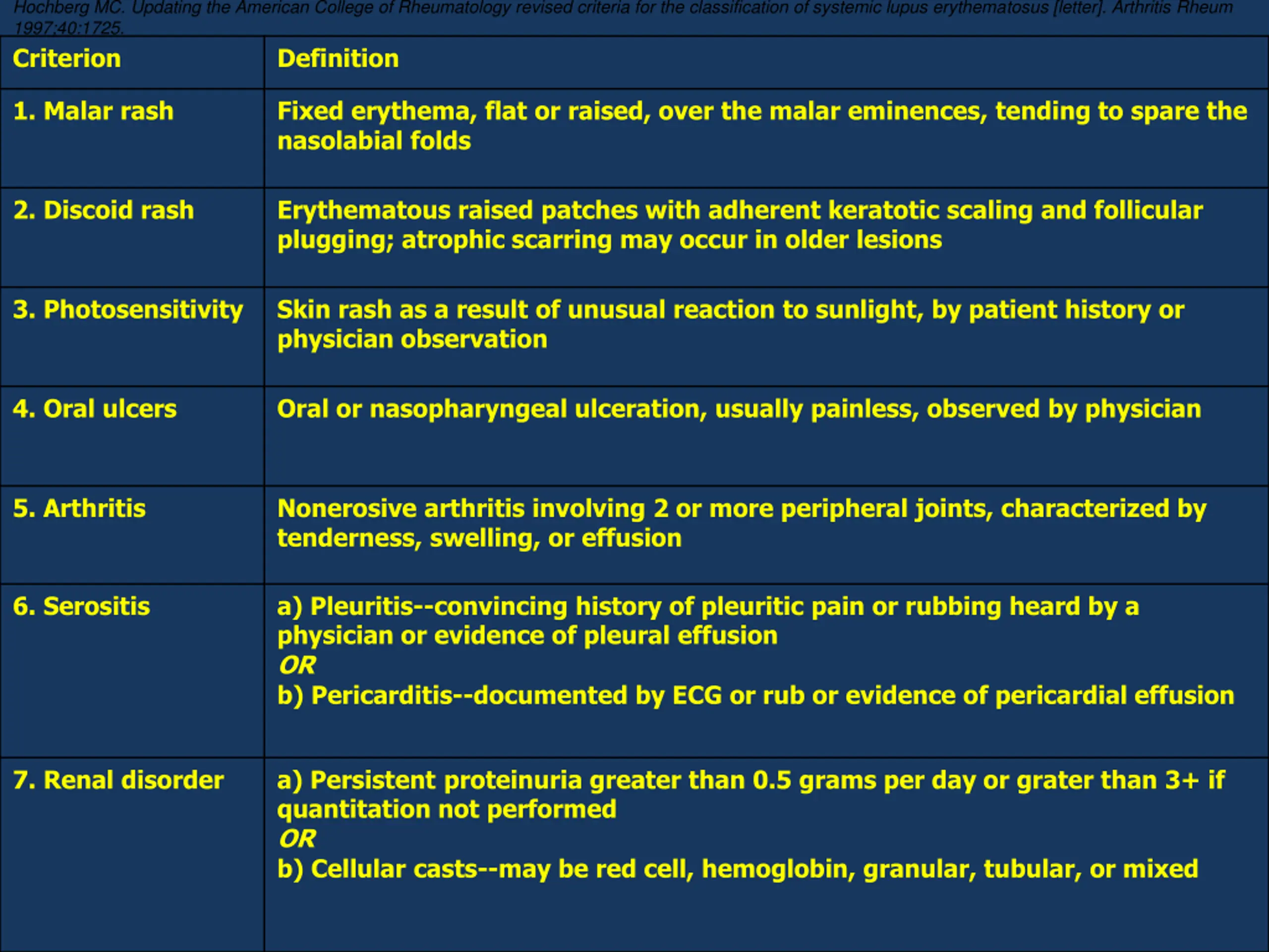 Hochberg MC. Updating the American College of Rheumatology revised criteria for the classification of systemic lupus erythematosus [letter]. Arthritis Rheum 1997;40:1725. Criterion Definition 1. Malar rash Fixed erythema, flat or raised, over the malar eminences, tending to spare the nasolabial folds 2. Discoid rash Erythematous raised patches with adherent keratotic scaling and follicular plugging; atrophic scarring may occur in older lesions 3. Photosensitivity Skin rash as a result of unusual reaction to sunlight, by patient history or physician observation 4. Oral ulcers Oral or nasopharyngeal ulceration, usually painless, observed by physician 5. Arthritis Nonerosive arthritis involving 2 or more peripheral joints, characterized by tenderness, swelling, or effusion 6. Serositis a) Pleuritis--convincing history of pleuritic pain or rubbing heard by a physician or evidence of pleural effusion OR b) Pericarditis--documented by ECG or rub or evidence of pericardial effusion 7. Renal disorder a) Persistent proteinuria greater than 0.5 grams per day or grater than 3+ if quantitation not performed OR b) Cellular casts--may be red cell, hemoglobin, granular, tubular, or mixed