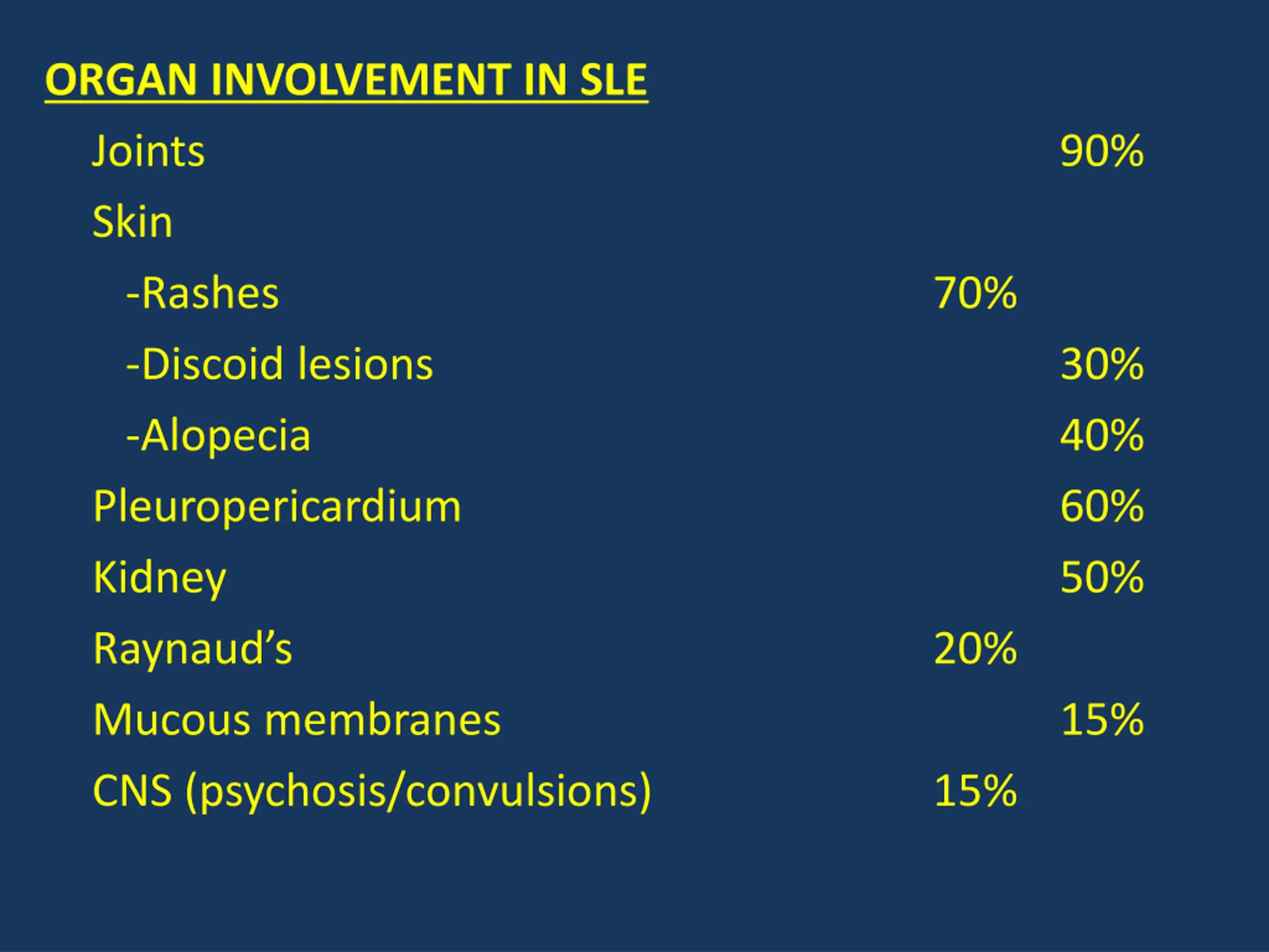 ORGAN INVOLVEMENT IN SLE Joints Skin -Rashes -Discoid lesions -Alopecia Pleuropericardium Kidney Raynaud s Mucous membranes CNS (psychosis/convulsions) 90% 70% 20% 15% 30% 40% 60% 50% 15%