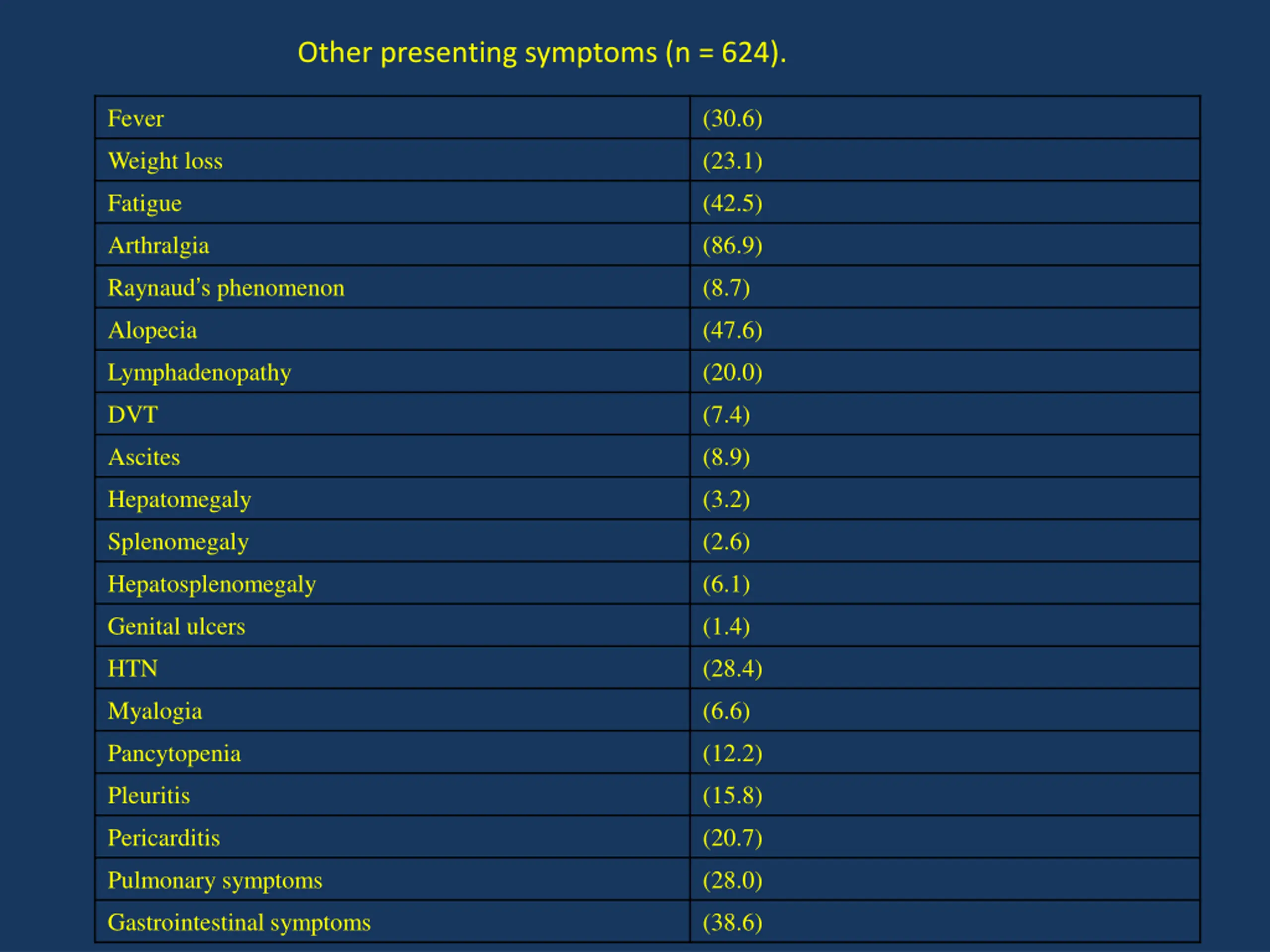 Other presenting symptoms (n = 624). Fever (30.6) Weight loss (23.1) Fatigue (42.5) Arthralgia (86.9) Raynaud s phenomenon (8.7) Alopecia (47.6) Lymphadenopathy (20.0) DVT (7.4) Ascites (8.9) Hepatomegaly (3.2) Splenomegaly (2.6) Hepatosplenomegaly (6.1) Genital ulcers (1.4) HTN (28.4) Myalogia (6.6) Pancytopenia (12.2) Pleuritis (15.8) Pericarditis (20.7) Pulmonary symptoms (28.0) Gastrointestinal symptoms (38.6)