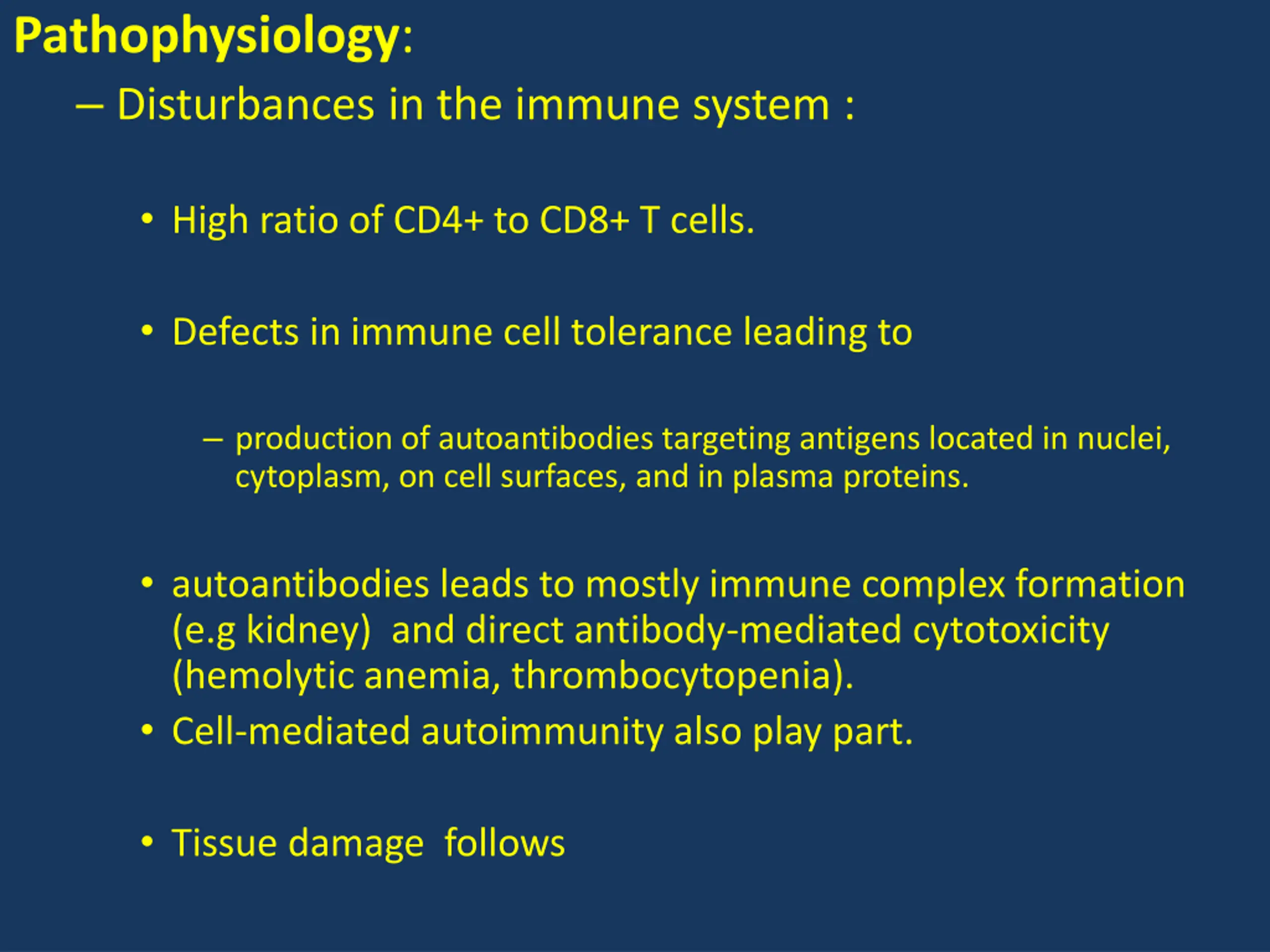 Pathophysiology: Disturbances in the immune system : High ratio of CD4+ to CD8+ T cells. Defects in immune cell tolerance leading to production of autoantibodies targeting antigens located in nuclei, cytoplasm, on cell surfaces, and in plasma proteins. autoantibodies leads to mostly immune complex formation (e.g kidney) and direct antibody-mediated cytotoxicity (hemolytic anemia, thrombocytopenia). Cell-mediated autoimmunity also play part. Tissue damage follows