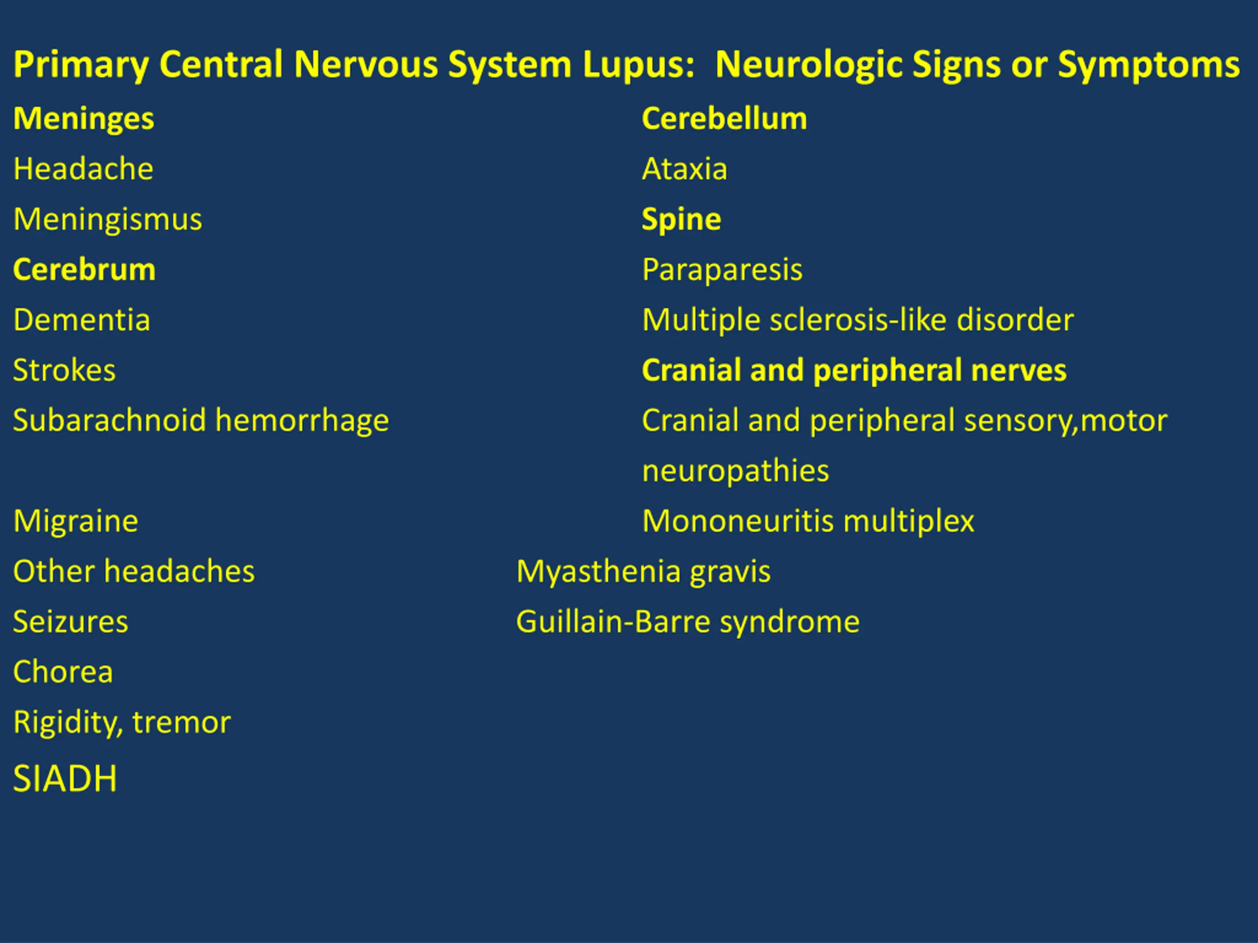 Primary Central Nervous System Lupus: Neurologic Signs or Symptoms Meninges Headache Meningismus Cerebrum Dementia Strokes Subarachnoid hemorrhage Migraine Other headaches Myasthenia gravis Seizures Guillain-Barre syndrome Chorea Rigidity, tremor SIADH Cerebellum Ataxia Spine Paraparesis Multiple sclerosis-like disorder Cranial and peripheral nerves Cranial and peripheral sensory,motor neuropathies Mononeuritis multiplex