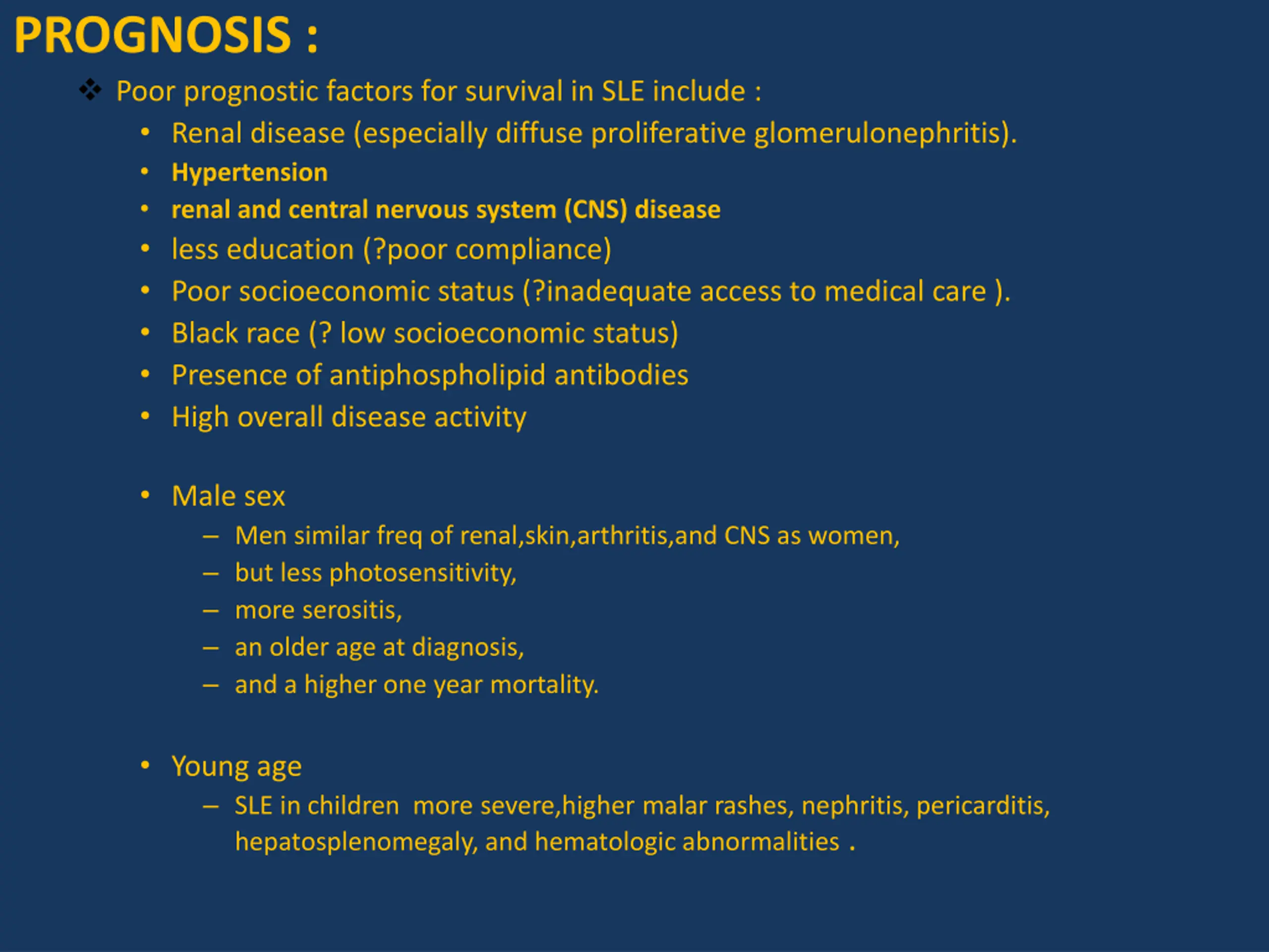 PROGNOSIS : Poor prognostic factors for survival in SLE include : Renal disease (especially diffuse proliferative glomerulonephritis). Hypertension renal and central nervous system (CNS) disease less education (?poor compliance) Poor socioeconomic status (?inadequate access to medical care ). Black race (? low socioeconomic status) Presence of antiphospholipid antibodies High overall disease activity Male sex Men similar freq of renal,skin,arthritis,and CNS as women, but less photosensitivity, more serositis, an older age at diagnosis, and a higher one year mortality. Young age SLE in children more severe,higher malar rashes, nephritis, pericarditis, hepatosplenomegaly, and hematologic abnormalities .
