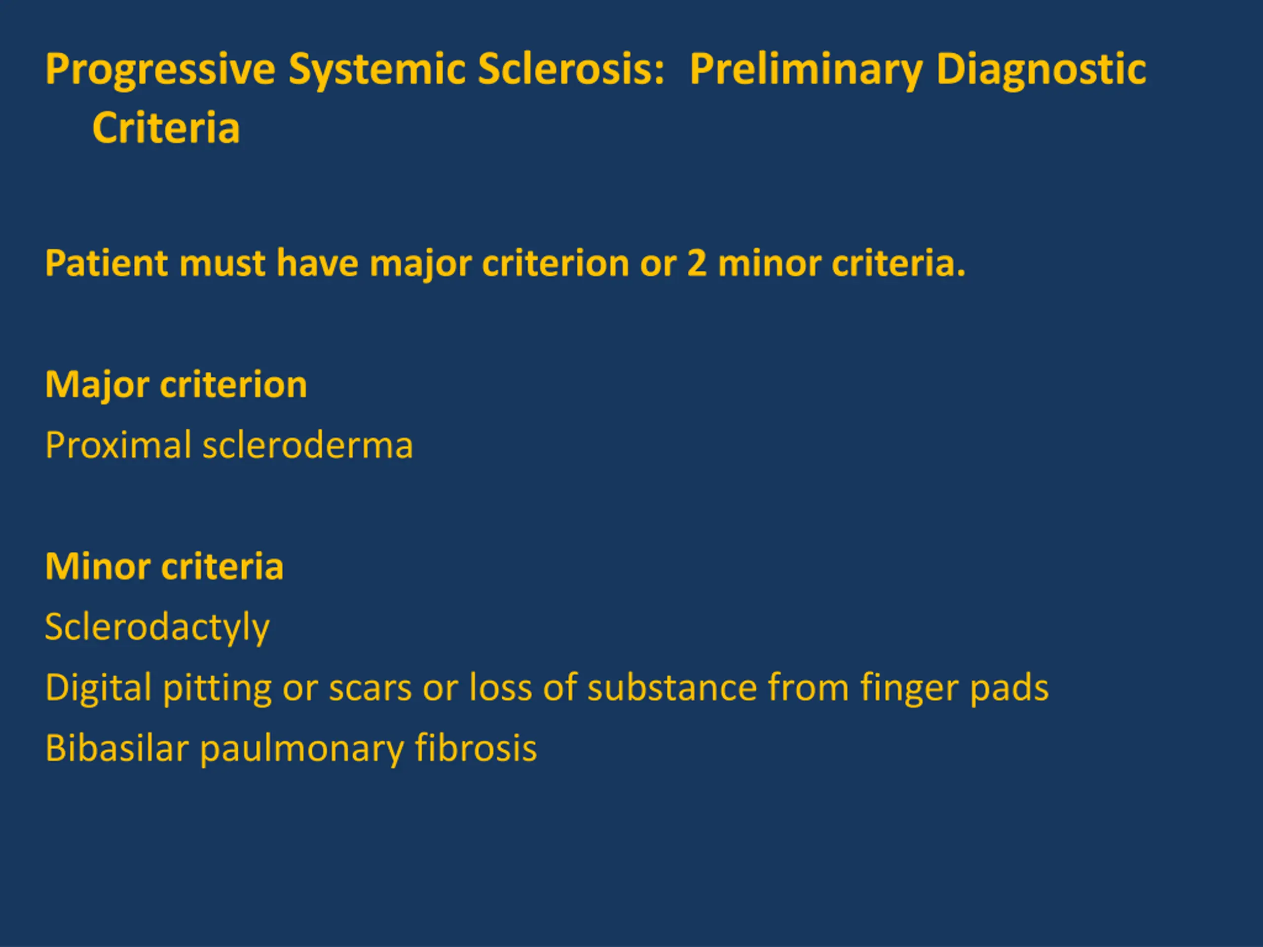 Progressive Systemic Sclerosis: Preliminary Diagnostic Criteria Patient must have major criterion or 2 minor criteria. Major criterion Proximal scleroderma Minor criteria Sclerodactyly Digital pitting or scars or loss of substance from finger pads Bibasilar paulmonary fibrosis