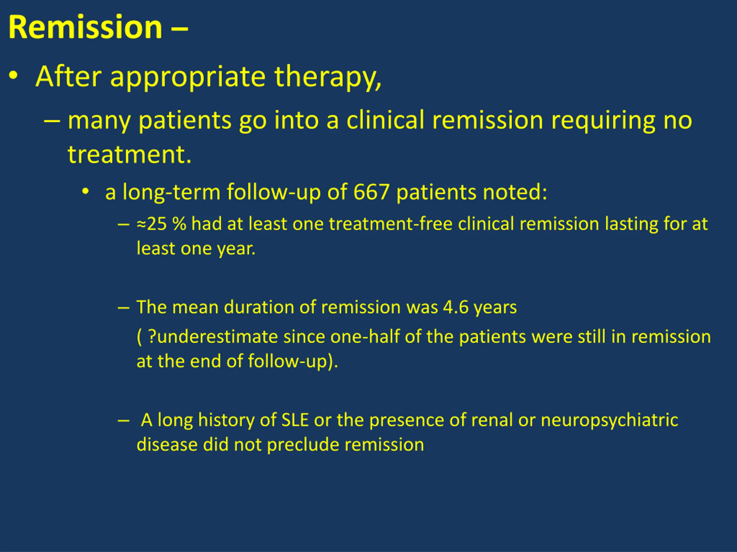 Remission After appropriate therapy, many patients go into a clinical remission requiring no treatment. a long-term follow-up of 667 patients noted: 25 % had at least one treatment-free clinical remission lasting for at least one year. The mean duration of remission was 4.6 years ( ?underestimate since one-half of the patients were still in remission at the end of follow-up). A long history of SLE or the presence of renal or neuropsychiatric disease did not preclude remission
