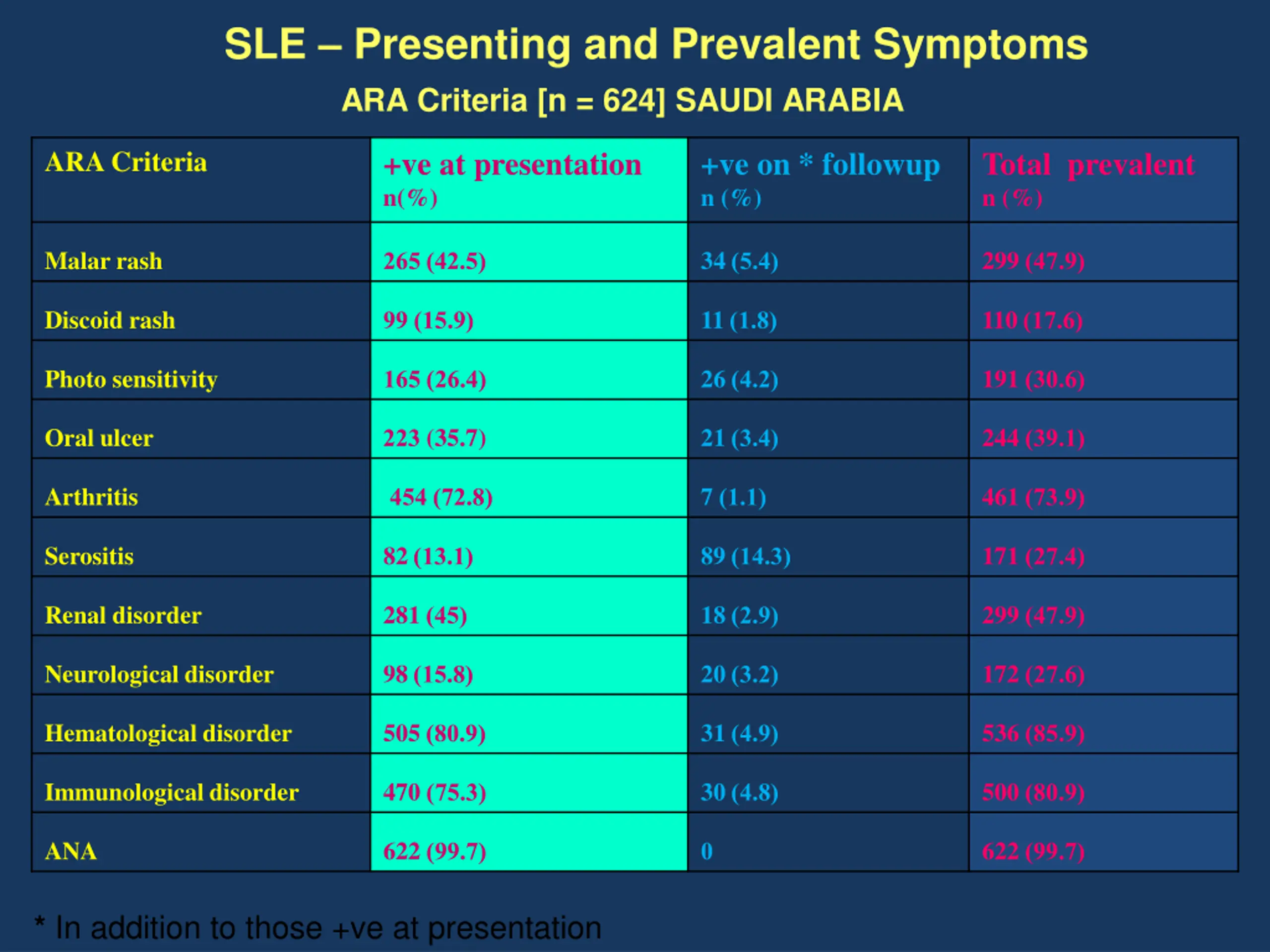 SLE Presenting and Prevalent Symptoms ARA Criteria [n = 624] SAUDI ARABIA +ve at presentation n(%) +ve on * followup n (%) Total prevalent n (%) ARA Criteria Malar rash 34 299 265 ) 42.5 ( ) 5.4 ( ) 47.9 ( Discoid rash 11 110 99 ) 15.9 ( ) 1.8 ( ) 17.6 ( Photo sensitivity 26 191 165 ) 26.4 ( ) 4.2 ( ) 30.6 ( 223 (35.7) Oral ulcer 21 244 ) 3.4 ( ) 39.1 ( Arthritis 7 461 454 ) 72.8 ( ) 1.1 ( ) 73.9 ( Serositis 82 89 171 ) 13.1 ( ) 14.3 ( ) 27.4 ( Renal disorder 281 18 299 ) 45 ( ) 2.9 ( ) 47.9 ( Neurological disorder 98 20 172 ) 15.8 ( ) 3.2 ( ) 27.6 ( Hematological disorder 505 31 536 ) 80.9 ( ) 4.9 ( ) 85.9 ( Immunological disorder 470 30 500 ) 75.3 ( ) 4.8 ( ) 80.9 ( ANA 622 622 ) 99.7 ( 0 ) 99.7 ( * In addition to those +ve at presentation