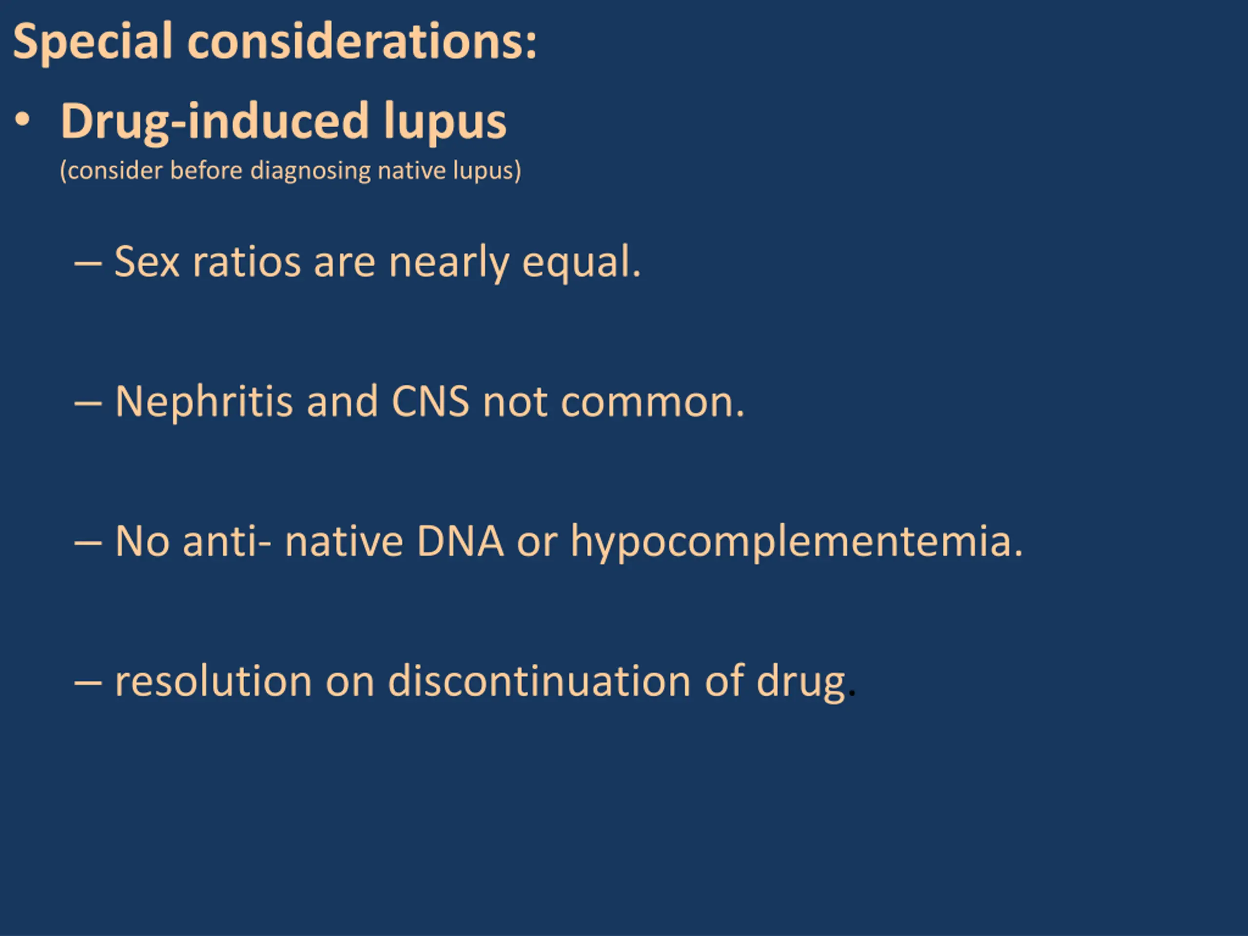 Special considerations: Drug-induced lupus (consider before diagnosing native lupus) Sex ratios are nearly equal. Nephritis and CNS not common. No anti- native DNA or hypocomplementemia. resolution on discontinuation of drug.