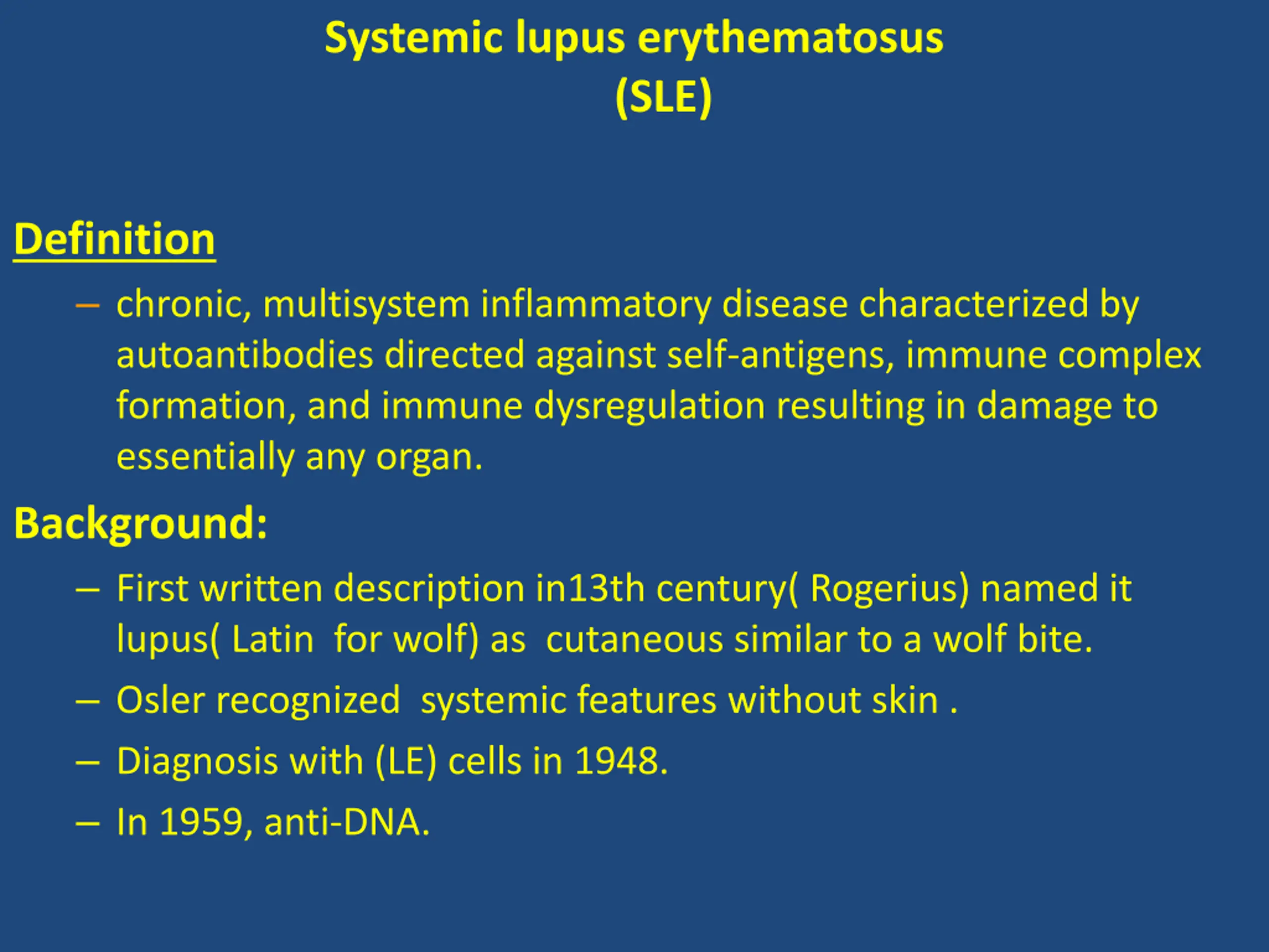 Systemic lupus erythematosus (SLE) Definition chronic, multisystem inflammatory disease characterized by autoantibodies directed against self-antigens, immune complex formation, and immune dysregulation resulting in damage to essentially any organ. Background: First written description in13th century( Rogerius) named it lupus( Latin for wolf) as cutaneous similar to a wolf bite. Osler recognized systemic features without skin . Diagnosis with (LE) cells in 1948. In 1959, anti-DNA.