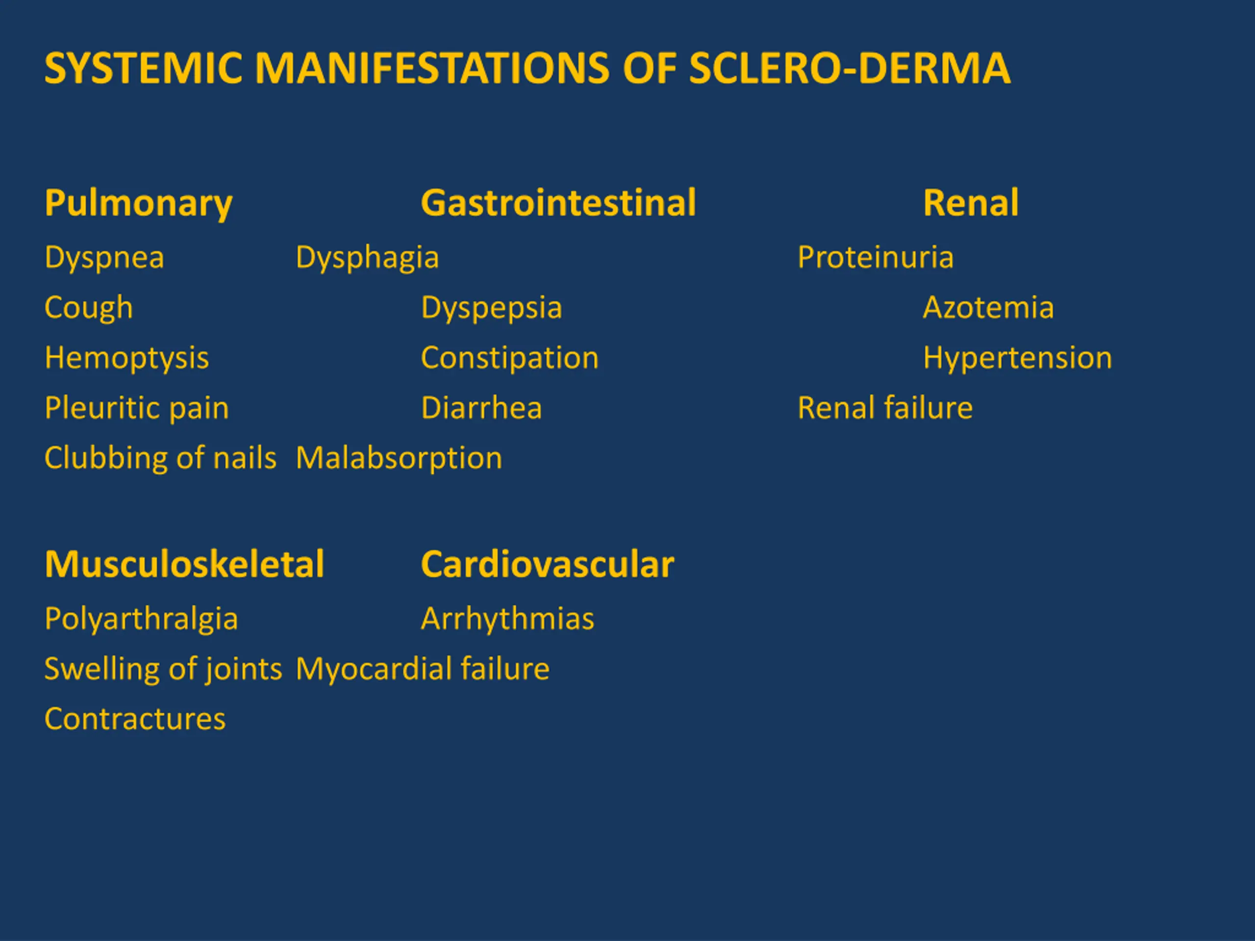 SYSTEMIC MANIFESTATIONS OF SCLERO-DERMA Pulmonary Dyspnea Cough Hemoptysis Pleuritic pain Clubbing of nails Malabsorption Dysphagia Gastrointestinal Dyspepsia Constipation Diarrhea Proteinuria Renal failure Renal Azotemia Hypertension Musculoskeletal Polyarthralgia Swelling of joints Myocardial failure Contractures Cardiovascular Arrhythmias