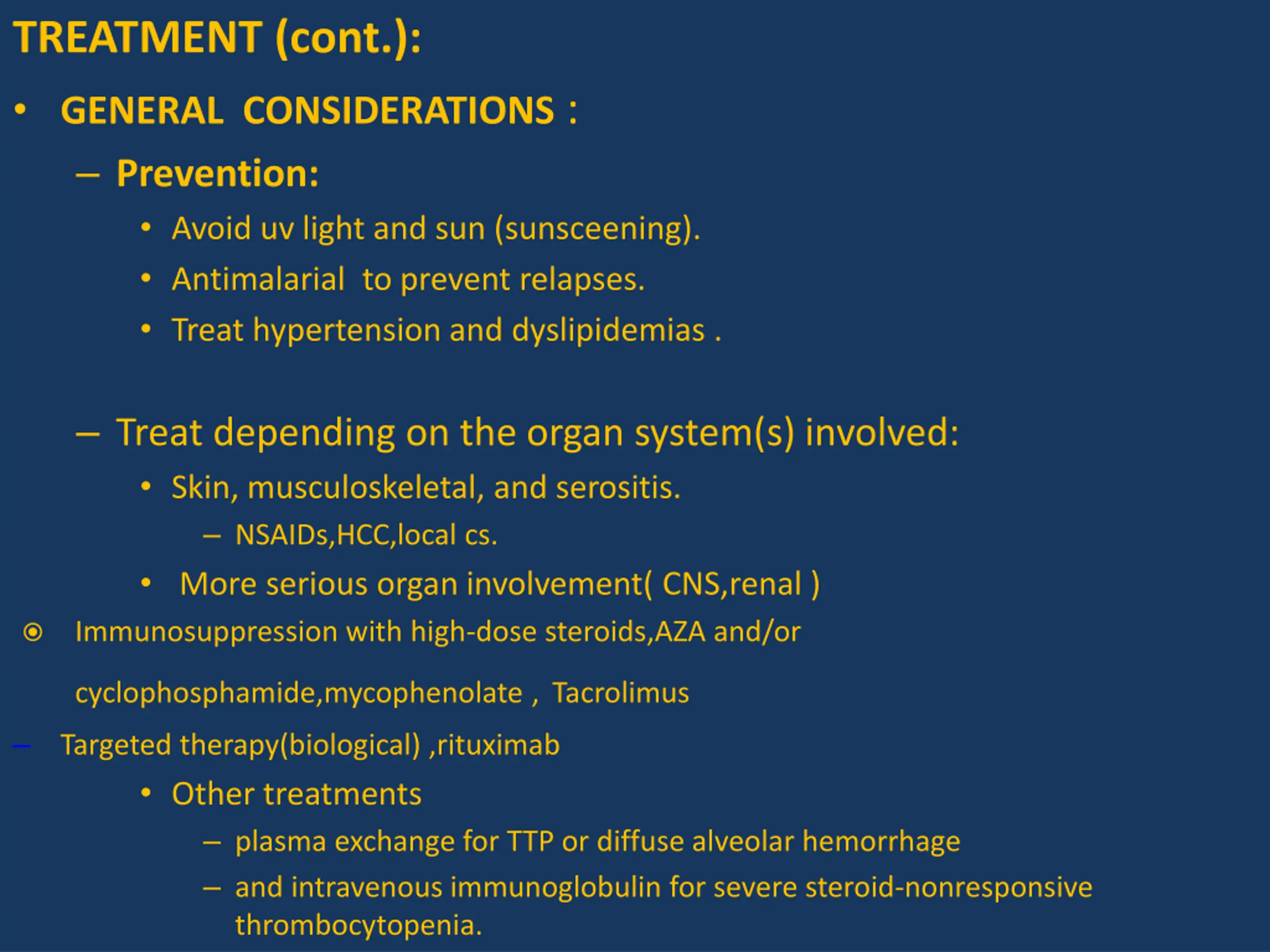TREATMENT (cont.): GENERAL CONSIDERATIONS : Prevention: Avoid uv light and sun (sunsceening). Antimalarial to prevent relapses. Treat hypertension and dyslipidemias . Treat depending on the organ system(s) involved: Skin, musculoskeletal, and serositis. NSAIDs,HCC,local cs. More serious organ involvement( CNS,renal ) Immunosuppression with high-dose steroids,AZA and/or cyclophosphamide,mycophenolate ,Tacrolimus Targeted therapy(biological) ,rituximab Other treatments plasma exchange for TTP or diffuse alveolar hemorrhage and intravenous immunoglobulin for severe steroid-nonresponsive thrombocytopenia.
