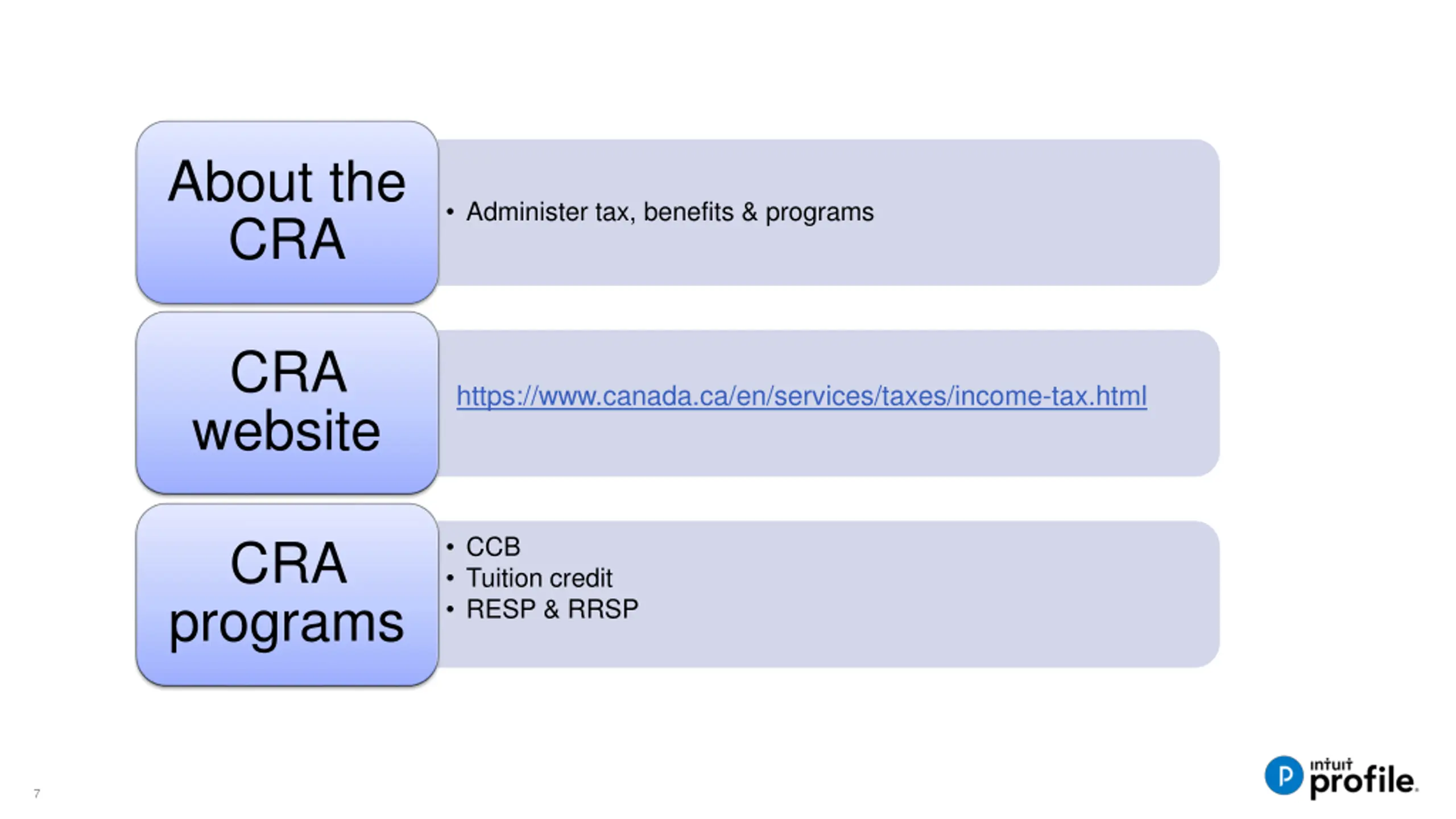 About the CRA Administer tax, benefits & programs CRA website https://www.canada.ca/en/services/taxes/income-tax.html CRA programs CCB Tuition credit RESP & RRSP 7
