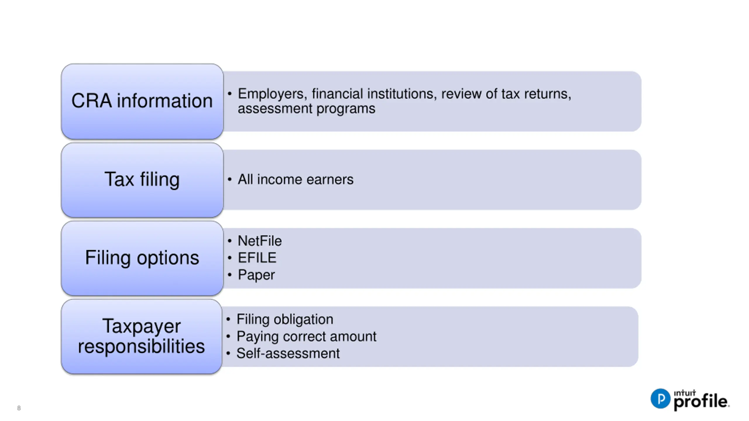 Employers, financial institutions, review of tax returns, assessment programs CRA information Tax filing All income earners NetFile EFILE Paper Filing options Filing obligation Paying correct amount Self-assessment Taxpayer responsibilities 8