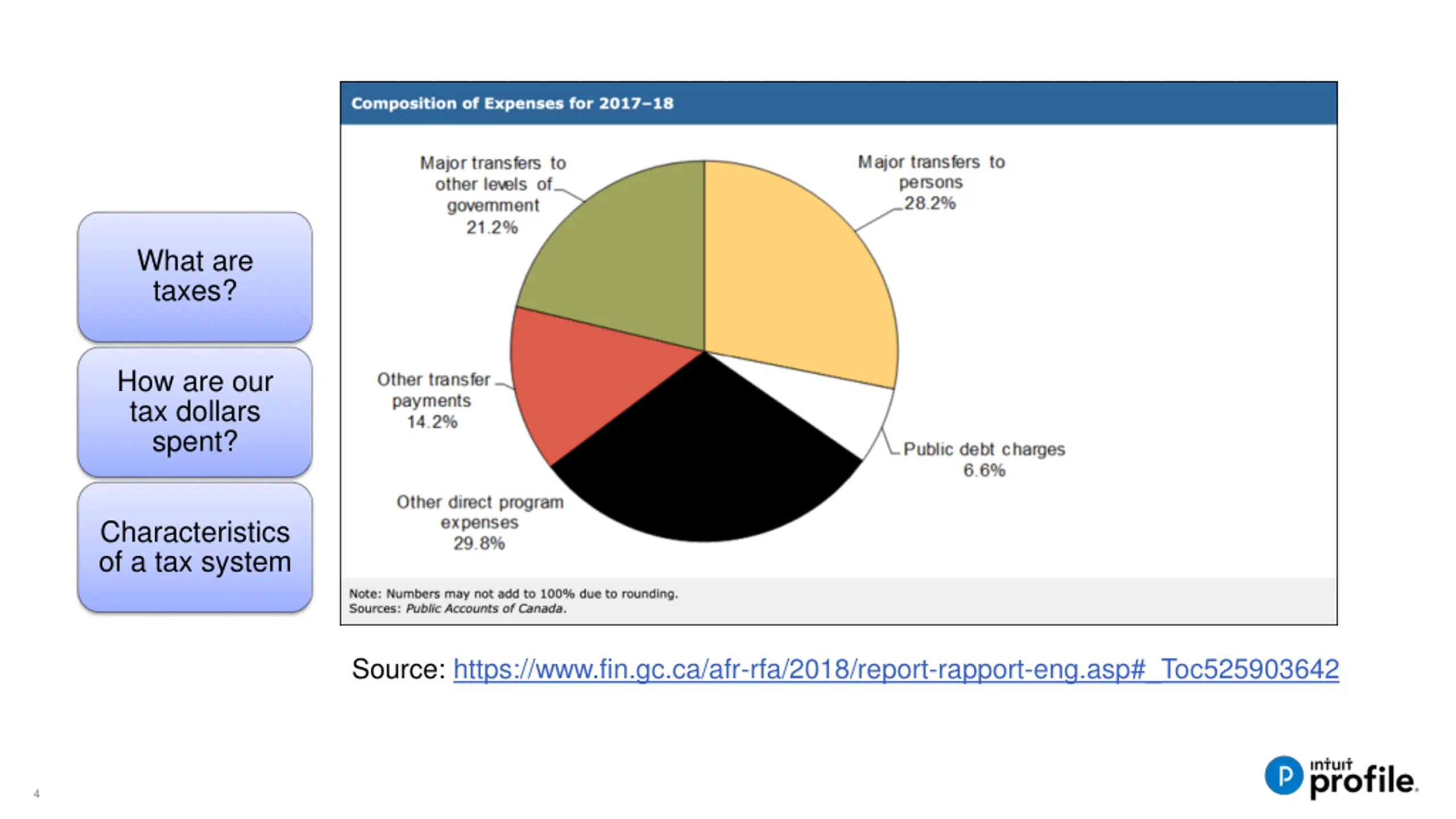 What are taxes? How are our tax dollars spent? Characteristics of a tax system Source: https://www.fin.gc.ca/afr-rfa/2018/report-rapport-eng.asp#_Toc525903642 4