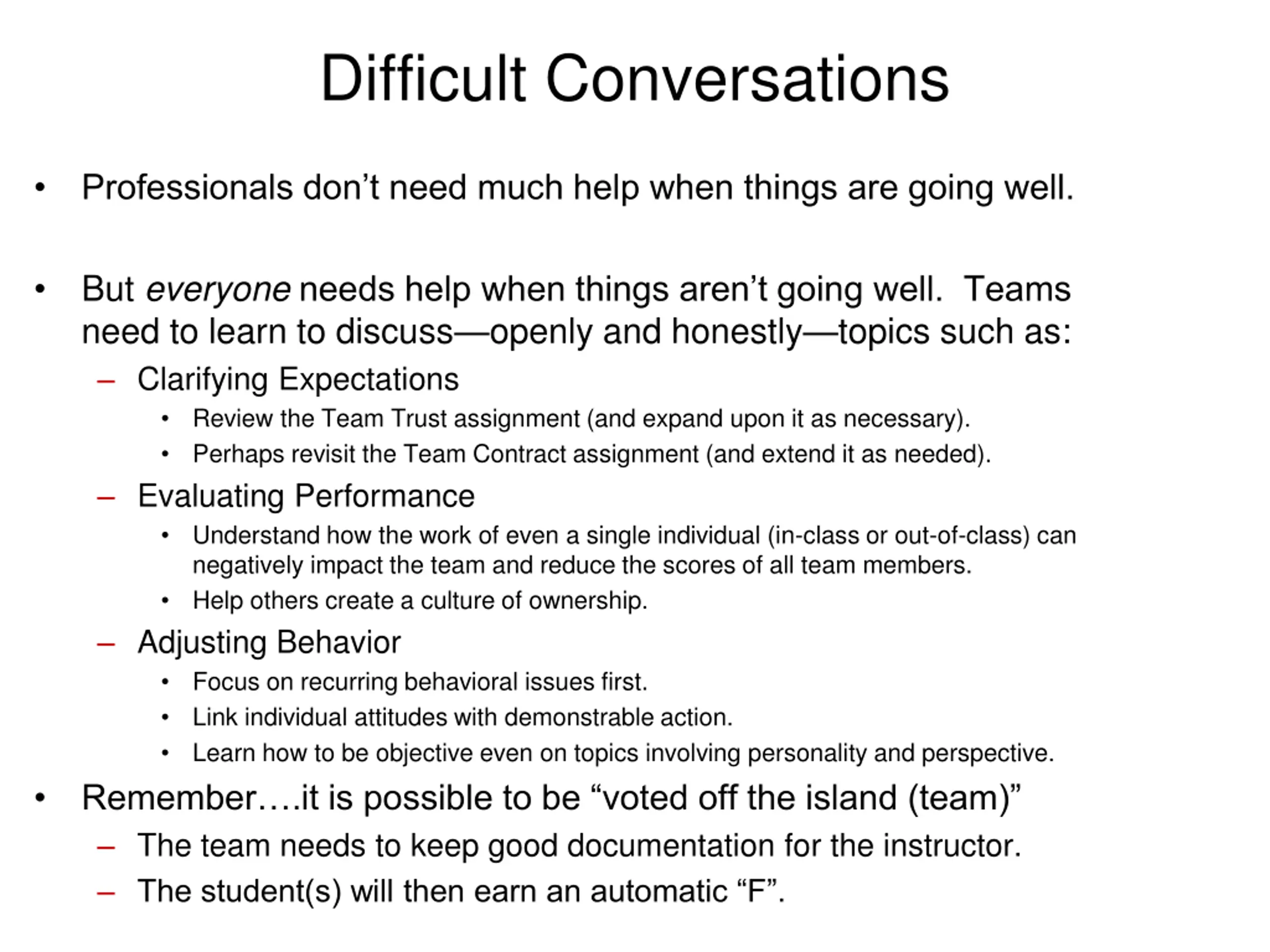 Difficult Conversations Professionals don t need much help when things are going well. But everyoneneeds help when things aren t going well. Teams need to learn to discuss openly and honestly topics such as: Clarifying Expectations Review the Team Trust assignment (and expand upon it as necessary). Perhaps revisit the Team Contract assignment (and extend it as needed). Evaluating Performance Understand how the work of even a single individual (in-class or out-of-class) can negatively impact the team and reduce the scores of all team members. Help others create a culture of ownership. Adjusting Behavior Focus on recurring behavioral issues first. Link individual attitudes with demonstrable action. Learn how to be objective even on topics involving personality and perspective. Remember .it is possible to be voted off the island (team) The team needs to keep good documentation for the instructor. The student(s) will then earn an automatic F .