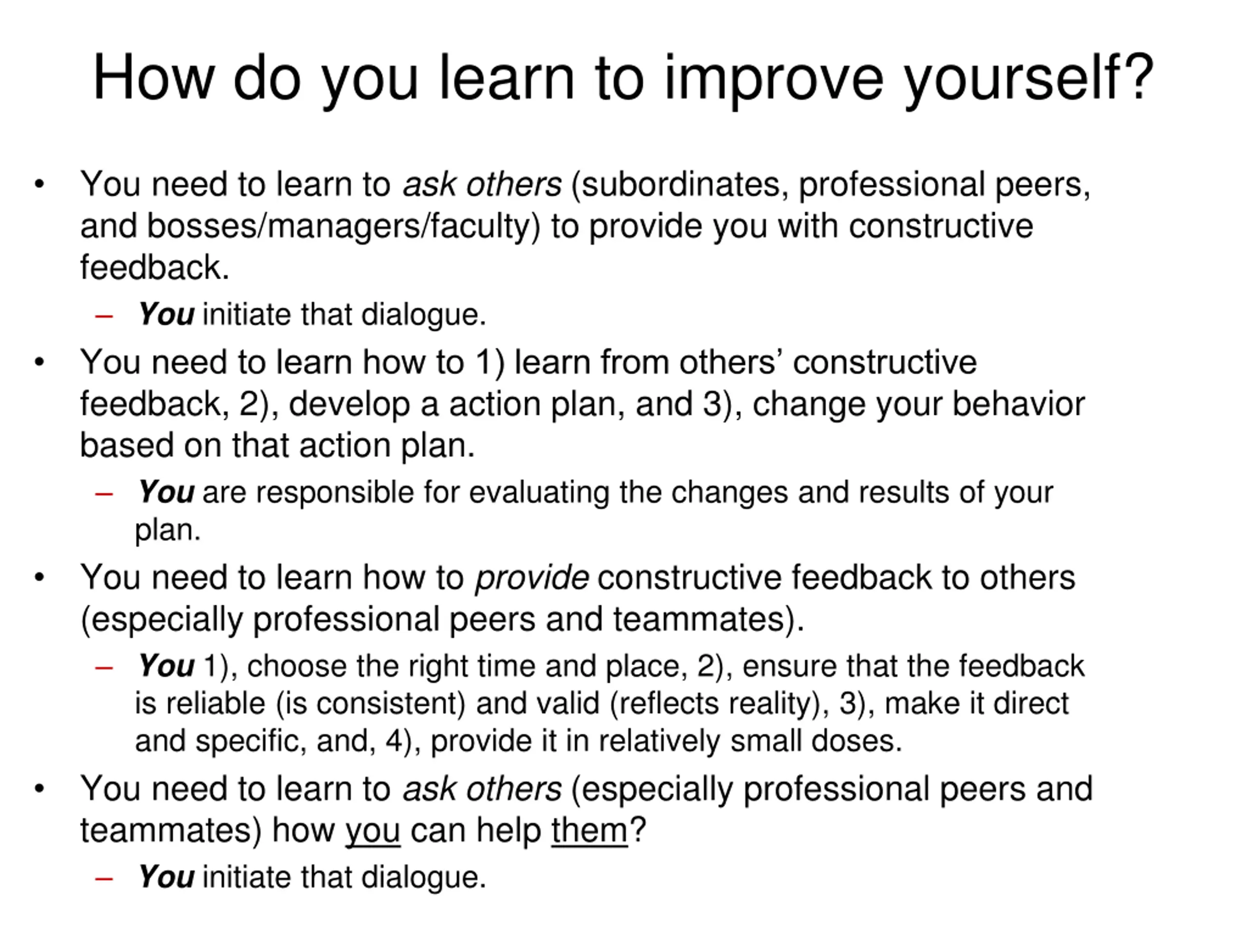 How do you learn to improve yourself? You need to learn to ask others (subordinates, professional peers, and bosses/managers/faculty) to provide you with constructive feedback. You initiate that dialogue. You need to learn how to 1) learn from others constructive feedback, 2), develop a action plan, and 3), change your behavior based on that action plan. You are responsible for evaluating the changes and results of your plan. You need to learn how to provide constructive feedback to others (especially professional peers and teammates). You 1), choose the right time and place, 2), ensure that the feedback is reliable (is consistent) and valid (reflects reality), 3), make it direct and specific, and, 4), provide it in relatively small doses. You need to learn to ask others (especially professional peers and teammates) how you can help them? You initiate that dialogue.