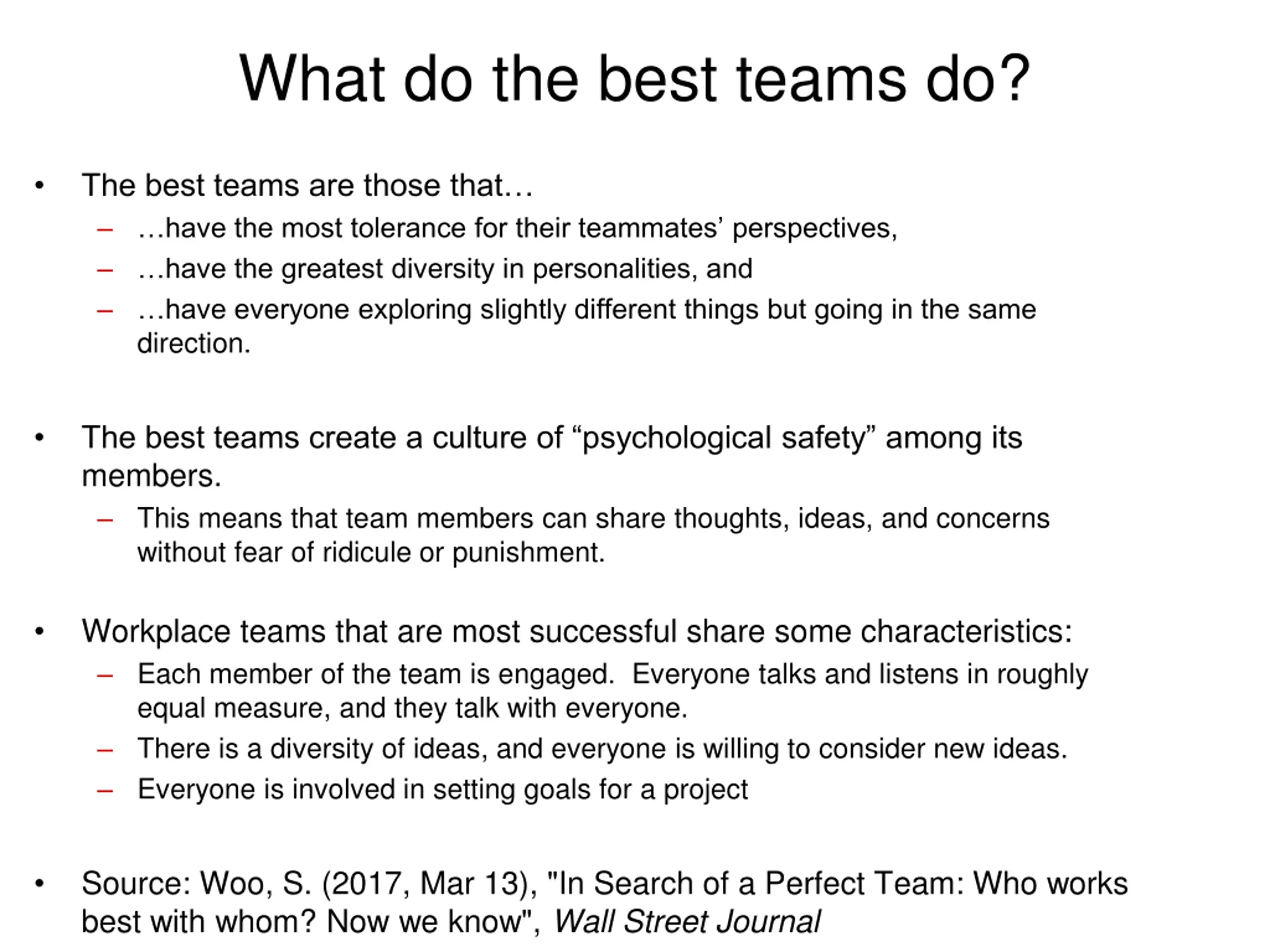 What do the best teams do? The best teams are those that have the most tolerance for their teammates perspectives, have the greatest diversity in personalities, and have everyone exploring slightly different things but going in the same direction. The best teams create a culture of psychological safety among its members. This means that team members can share thoughts, ideas, and concerns without fear of ridicule or punishment. Workplace teams that are most successful share some characteristics: Each member of the team is engaged. Everyone talks and listens in roughly equal measure, and they talk with everyone. There is a diversity of ideas, and everyone is willing to consider new ideas. Everyone is involved in setting goals for a project Source: Woo, S. (2017, Mar 13), "In Search of a Perfect Team: Who works best with whom? Now we know", Wall Street Journal
