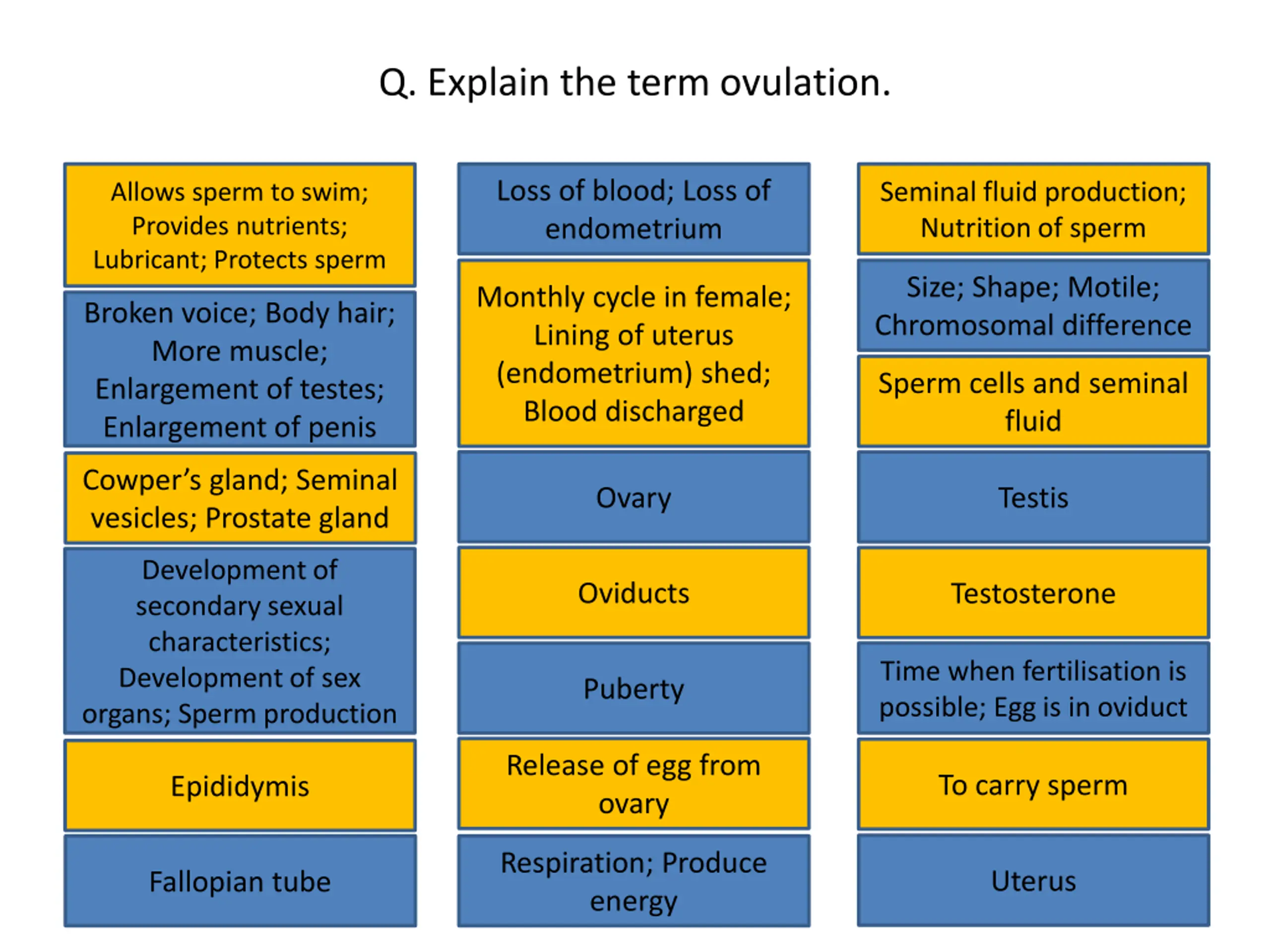Q. Explain the term ovulation. Loss of blood; Loss of endometrium Allows sperm to swim; Provides nutrients; Lubricant; Protects sperm Seminal fluid production; Nutrition of sperm Loss of blood; Loss of endometrium Seminal fluid production; Nutrition of sperm Allows sperm to swim; Provides nutrients; Lubricant; Protects sperm Size; Shape; Motile; Chromosomal difference Monthly cycle in female; Lining of uterus (endometrium) shed; Blood discharged Size; Shape; Motile; Chromosomal difference Monthly cycle in female; Lining of uterus (endometrium) shed; Blood discharged Broken voice; Body hair; More muscle; Enlargement of testes; Enlargement of penis Broken voice; Body hair; More muscle; Enlargement of testes; Enlargement of penis Sperm cells and seminal fluid Sperm cells and seminal fluid Ovary Testis Cowper s gland; Seminal vesicles; Prostate gland Cowper s gland; Seminal Ovary Testis Development of secondary sexual characteristics; Development of sex organs; Sperm production vesicles; Prostate gland Oviducts Testosterone Development of secondary sexual characteristics; Development of sex organs; Sperm production Oviducts Testosterone Puberty Time when fertilisation is possible; Egg is in oviduct Time when fertilisation is possible; Egg is in oviduct Puberty Release of egg from ovary To carry sperm Epididymis Release of egg from ovary To carry sperm Epididymis Respiration; Produce energy Uterus Fallopian tube Respiration; Produce energy Uterus Fallopian tube