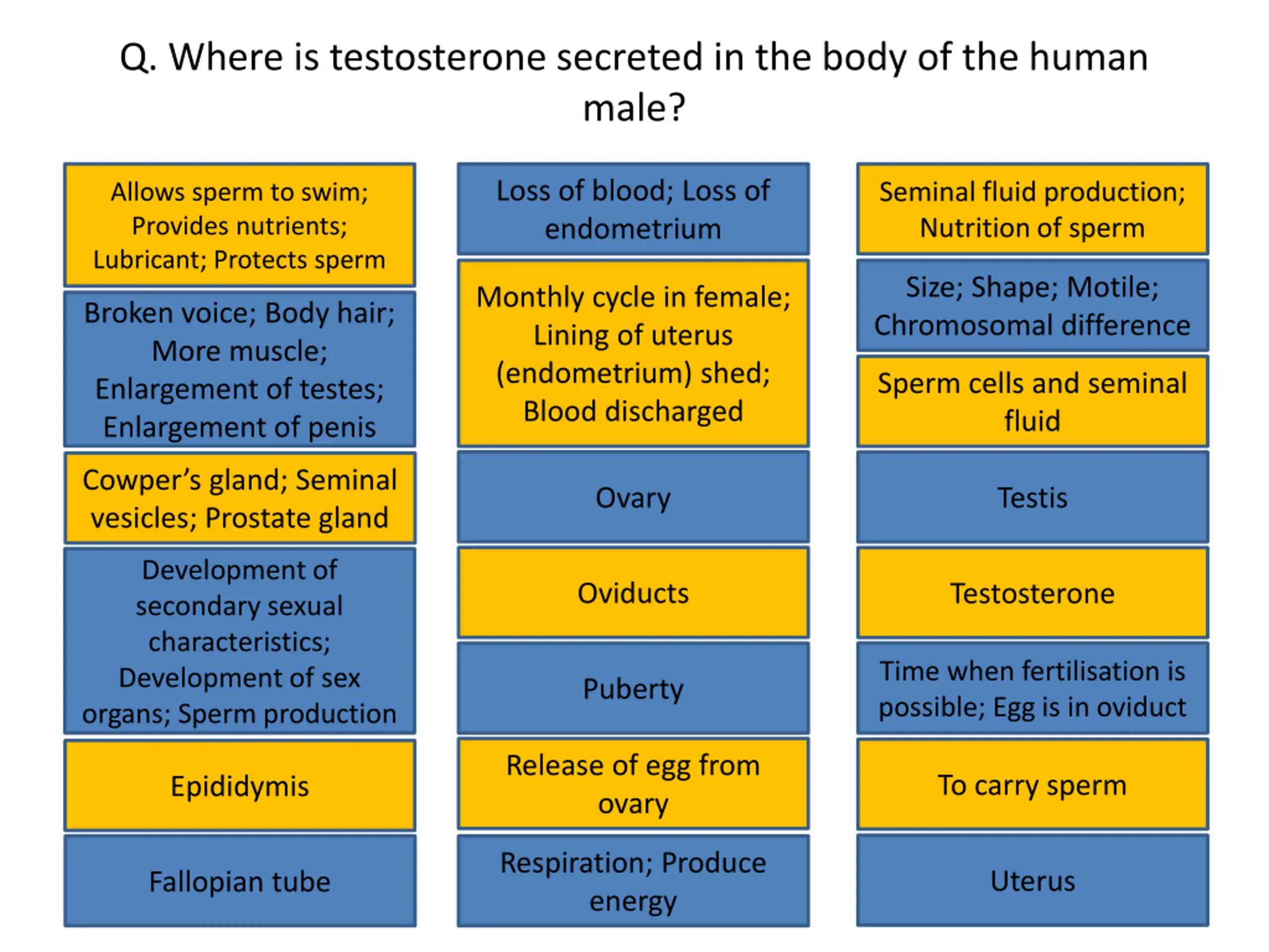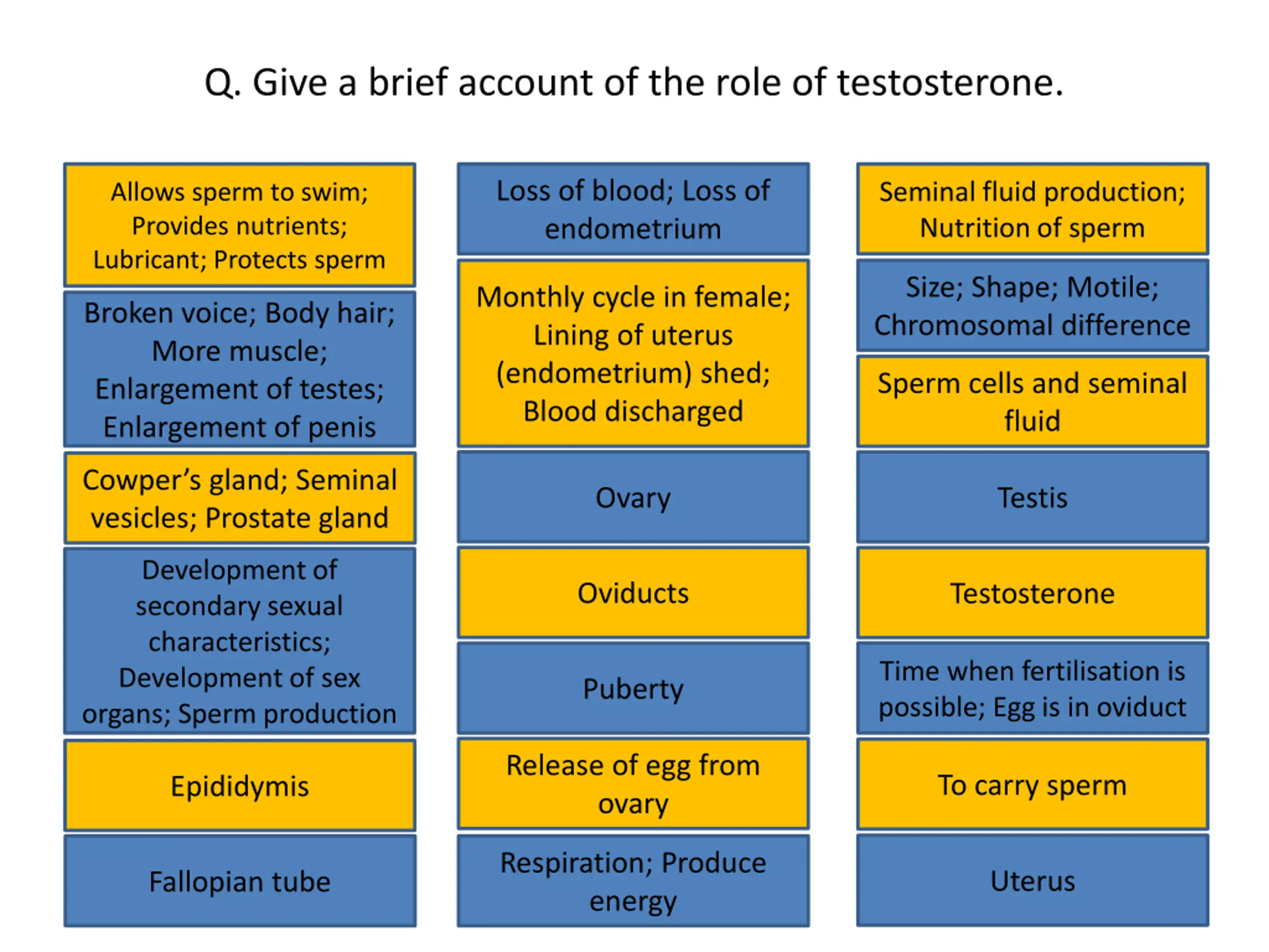 Q. Give a brief account of the role of testosterone. Loss of blood; Loss of endometrium Allows sperm to swim; Provides nutrients; Lubricant; Protects sperm Seminal fluid production; Nutrition of sperm Loss of blood; Loss of endometrium Seminal fluid production; Nutrition of sperm Allows sperm to swim; Provides nutrients; Lubricant; Protects sperm Size; Shape; Motile; Chromosomal difference Monthly cycle in female; Lining of uterus (endometrium) shed; Blood discharged Size; Shape; Motile; Chromosomal difference Monthly cycle in female; Lining of uterus (endometrium) shed; Blood discharged Broken voice; Body hair; More muscle; Enlargement of testes; Enlargement of penis Broken voice; Body hair; More muscle; Enlargement of testes; Enlargement of penis Sperm cells and seminal fluid Sperm cells and seminal fluid Ovary Testis Cowper s gland; Seminal vesicles; Prostate gland Cowper s gland; Seminal Ovary Testis Development of secondary sexual characteristics; Development of sex organs; Sperm production vesicles; Prostate gland Oviducts Testosterone Development of secondary sexual characteristics; Development of sex organs; Sperm production Oviducts Testosterone Puberty Time when fertilisation is possible; Egg is in oviduct Time when fertilisation is possible; Egg is in oviduct Puberty Release of egg from ovary To carry sperm Epididymis Release of egg from ovary To carry sperm Epididymis Respiration; Produce energy Uterus Fallopian tube Respiration; Produce energy Uterus Fallopian tube
