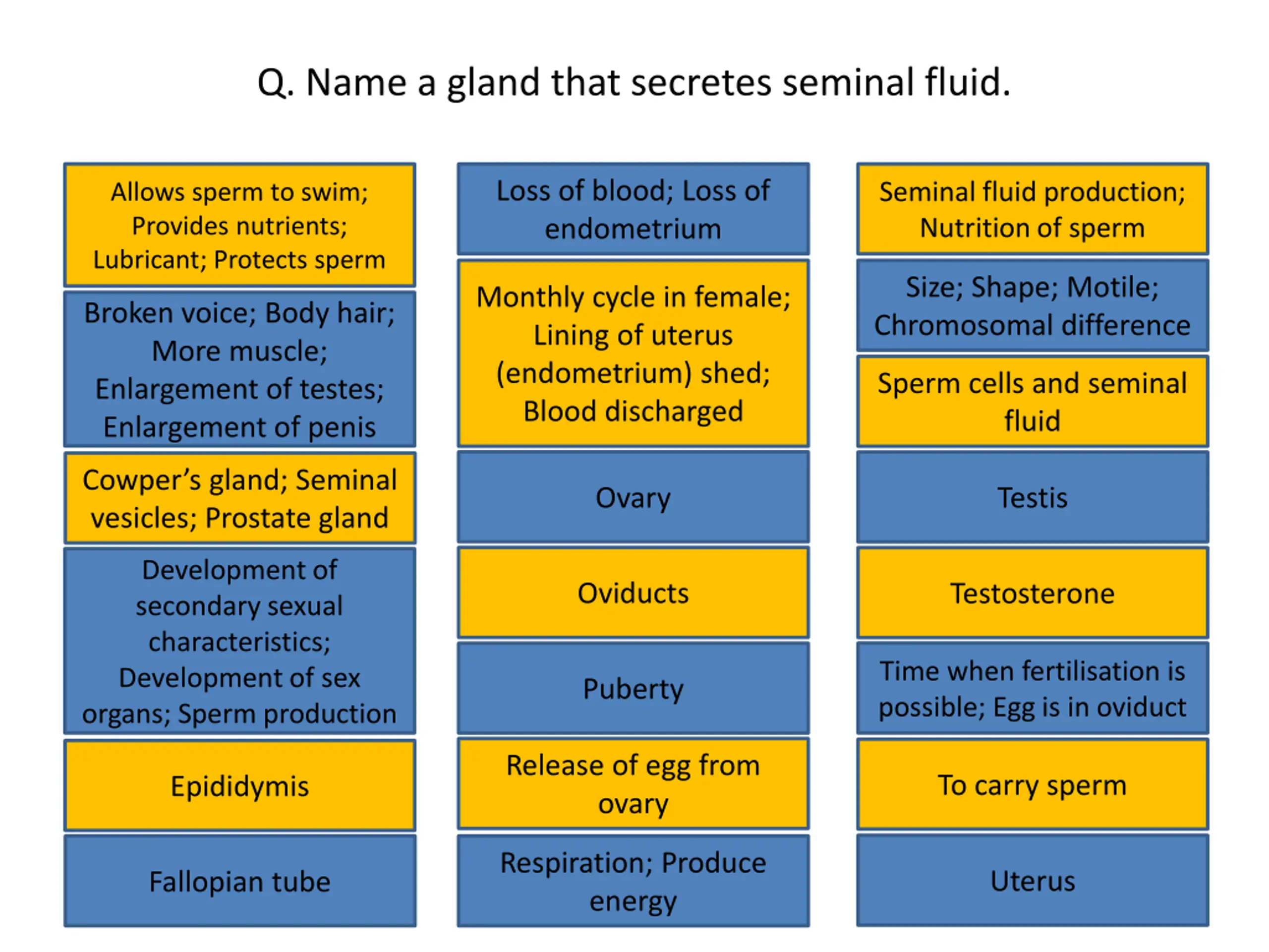 Q. Name a gland that secretes seminal fluid. Loss of blood; Loss of endometrium Allows sperm to swim; Provides nutrients; Lubricant; Protects sperm Seminal fluid production; Nutrition of sperm Loss of blood; Loss of endometrium Seminal fluid production; Nutrition of sperm Allows sperm to swim; Provides nutrients; Lubricant; Protects sperm Size; Shape; Motile; Chromosomal difference Monthly cycle in female; Lining of uterus (endometrium) shed; Blood discharged Size; Shape; Motile; Chromosomal difference Monthly cycle in female; Lining of uterus (endometrium) shed; Blood discharged Broken voice; Body hair; More muscle; Enlargement of testes; Enlargement of penis Broken voice; Body hair; More muscle; Enlargement of testes; Enlargement of penis Sperm cells and seminal fluid Sperm cells and seminal fluid Ovary Testis Cowper s gland; Seminal vesicles; Prostate gland Cowper s gland; Seminal Ovary Testis Development of secondary sexual characteristics; Development of sex organs; Sperm production vesicles; Prostate gland Oviducts Testosterone Development of secondary sexual characteristics; Development of sex organs; Sperm production Oviducts Testosterone Puberty Time when fertilisation is possible; Egg is in oviduct Time when fertilisation is possible; Egg is in oviduct Puberty Release of egg from ovary To carry sperm Epididymis Release of egg from ovary To carry sperm Epididymis Respiration; Produce energy Uterus Fallopian tube Respiration; Produce energy Uterus Fallopian tube