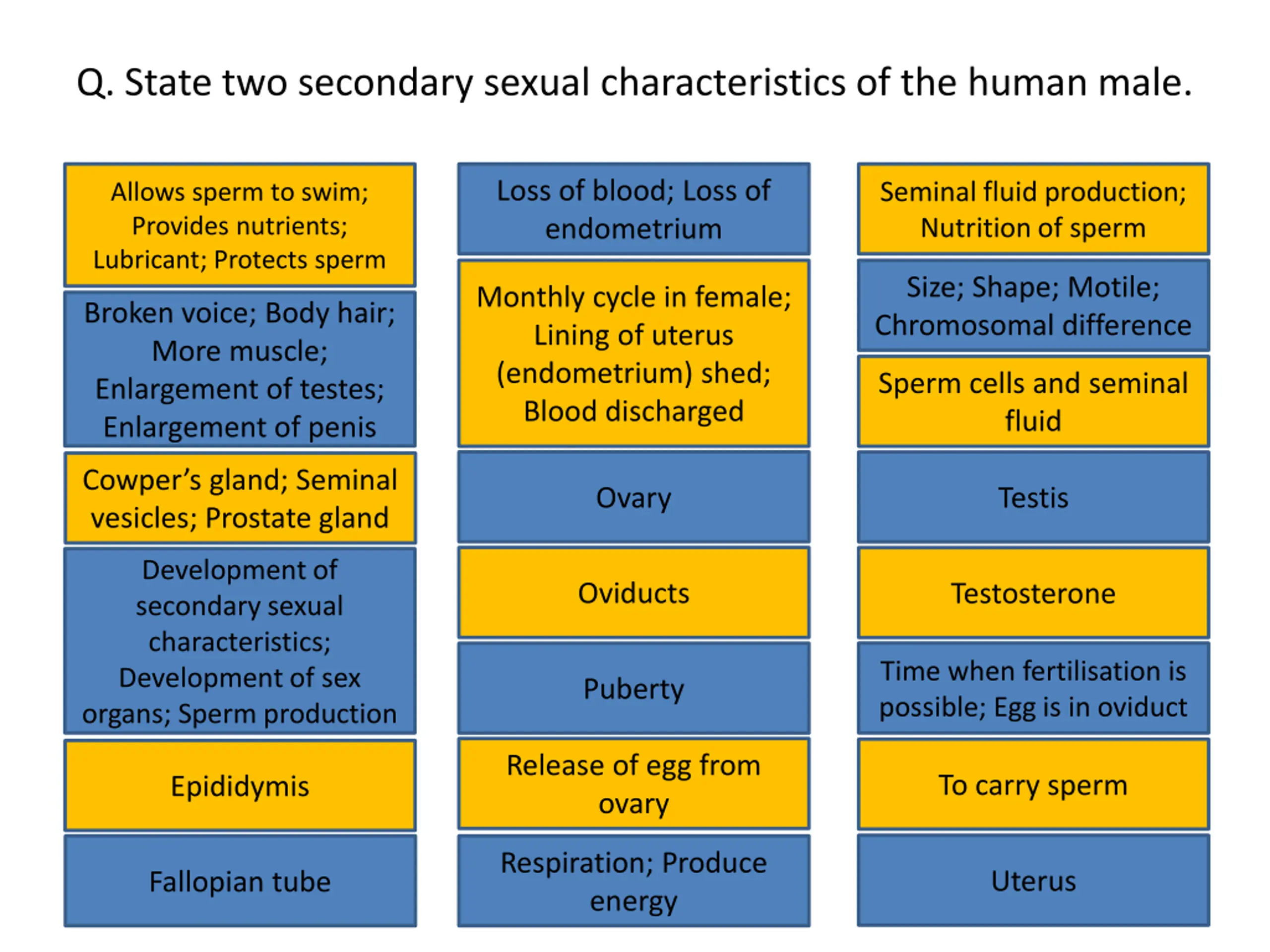 Q. What maintains the secondary sexual characteristics in the adult human male? Loss of blood; Loss of endometrium Allows sperm to swim; Provides nutrients; Lubricant; Protects sperm Seminal fluid production; Nutrition of sperm Loss of blood; Loss of endometrium Seminal fluid production; Nutrition of sperm Allows sperm to swim; Provides nutrients; Lubricant; Protects sperm Size; Shape; Motile; Chromosomal difference Monthly cycle in female; Lining of uterus (endometrium) shed; Blood discharged Size; Shape; Motile; Chromosomal difference Monthly cycle in female; Lining of uterus (endometrium) shed; Blood discharged Broken voice; Body hair; More muscle; Enlargement of testes; Enlargement of penis Broken voice; Body hair; More muscle; Enlargement of testes; Enlargement of penis Sperm cells and seminal fluid Sperm cells and seminal fluid Ovary Testis Cowper s gland; Seminal vesicles; Prostate gland Cowper s gland; Seminal Ovary Testis Development of secondary sexual characteristics; Development of sex organs; Sperm production vesicles; Prostate gland Oviducts Testosterone Development of secondary sexual characteristics; Development of sex organs; Sperm production Oviducts Testosterone Puberty Time when fertilisation is possible; Egg is in oviduct Time when fertilisation is possible; Egg is in oviduct Puberty Release of egg from ovary To carry sperm Epididymis Release of egg from ovary To carry sperm Epididymis Respiration; Produce energy Uterus Fallopian tube Respiration; Produce energy Uterus Fallopian tube