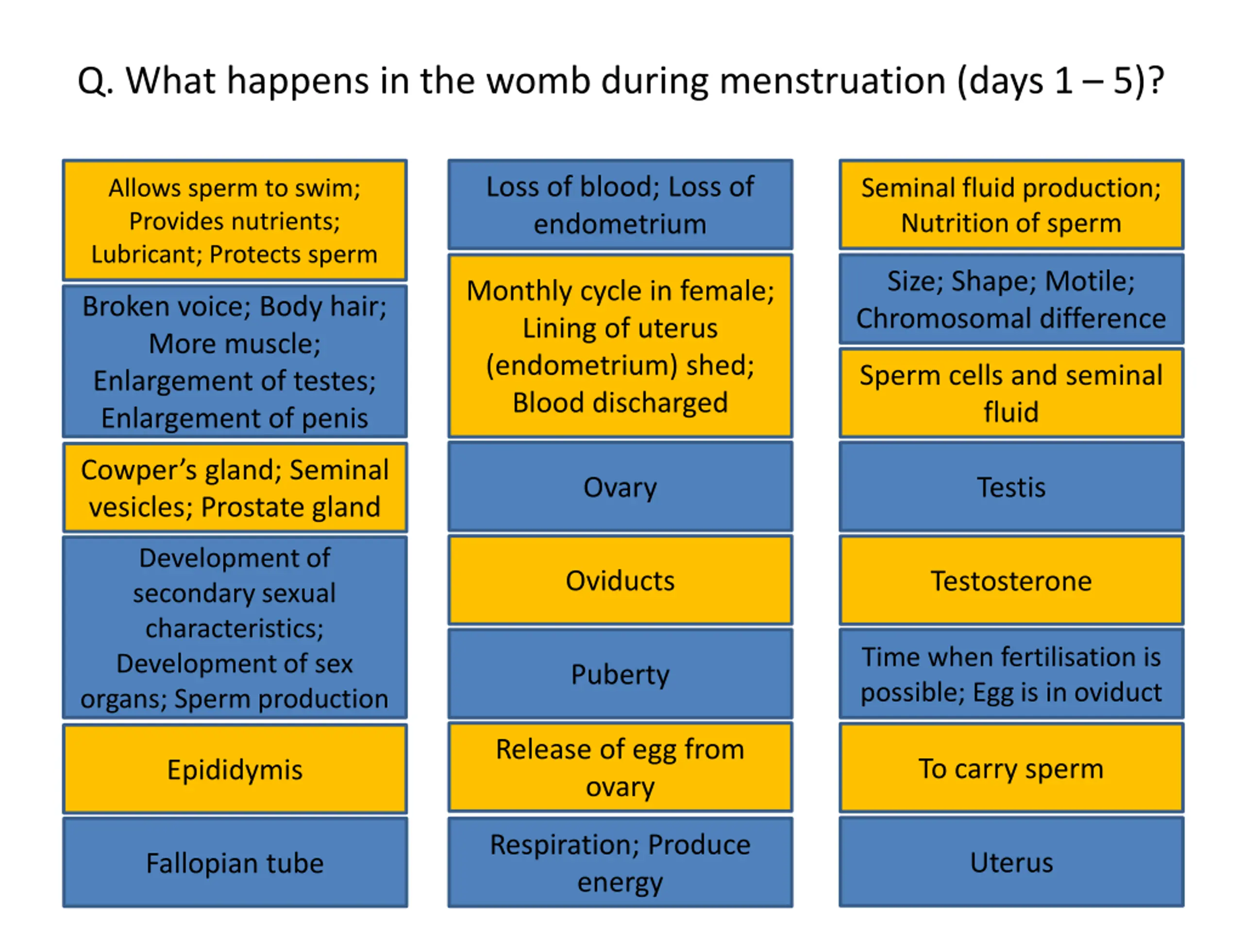 Q. What happens in the womb during menstruation (days 1 5)? Loss of blood; Loss of endometrium Allows sperm to swim; Provides nutrients; Lubricant; Protects sperm Seminal fluid production; Nutrition of sperm Loss of blood; Loss of endometrium Seminal fluid production; Nutrition of sperm Allows sperm to swim; Provides nutrients; Lubricant; Protects sperm Size; Shape; Motile; Chromosomal difference Monthly cycle in female; Lining of uterus (endometrium) shed; Blood discharged Size; Shape; Motile; Chromosomal difference Monthly cycle in female; Lining of uterus (endometrium) shed; Blood discharged Broken voice; Body hair; More muscle; Enlargement of testes; Enlargement of penis Broken voice; Body hair; More muscle; Enlargement of testes; Enlargement of penis Sperm cells and seminal fluid Sperm cells and seminal fluid Ovary Testis Cowper s gland; Seminal vesicles; Prostate gland Cowper s gland; Seminal Ovary Testis Development of secondary sexual characteristics; Development of sex organs; Sperm production vesicles; Prostate gland Oviducts Testosterone Development of secondary sexual characteristics; Development of sex organs; Sperm production Oviducts Testosterone Puberty Time when fertilisation is possible; Egg is in oviduct Time when fertilisation is possible; Egg is in oviduct Puberty Release of egg from ovary To carry sperm Epididymis Release of egg from ovary To carry sperm Epididymis Respiration; Produce energy Uterus Fallopian tube Respiration; Produce energy Uterus Fallopian tube