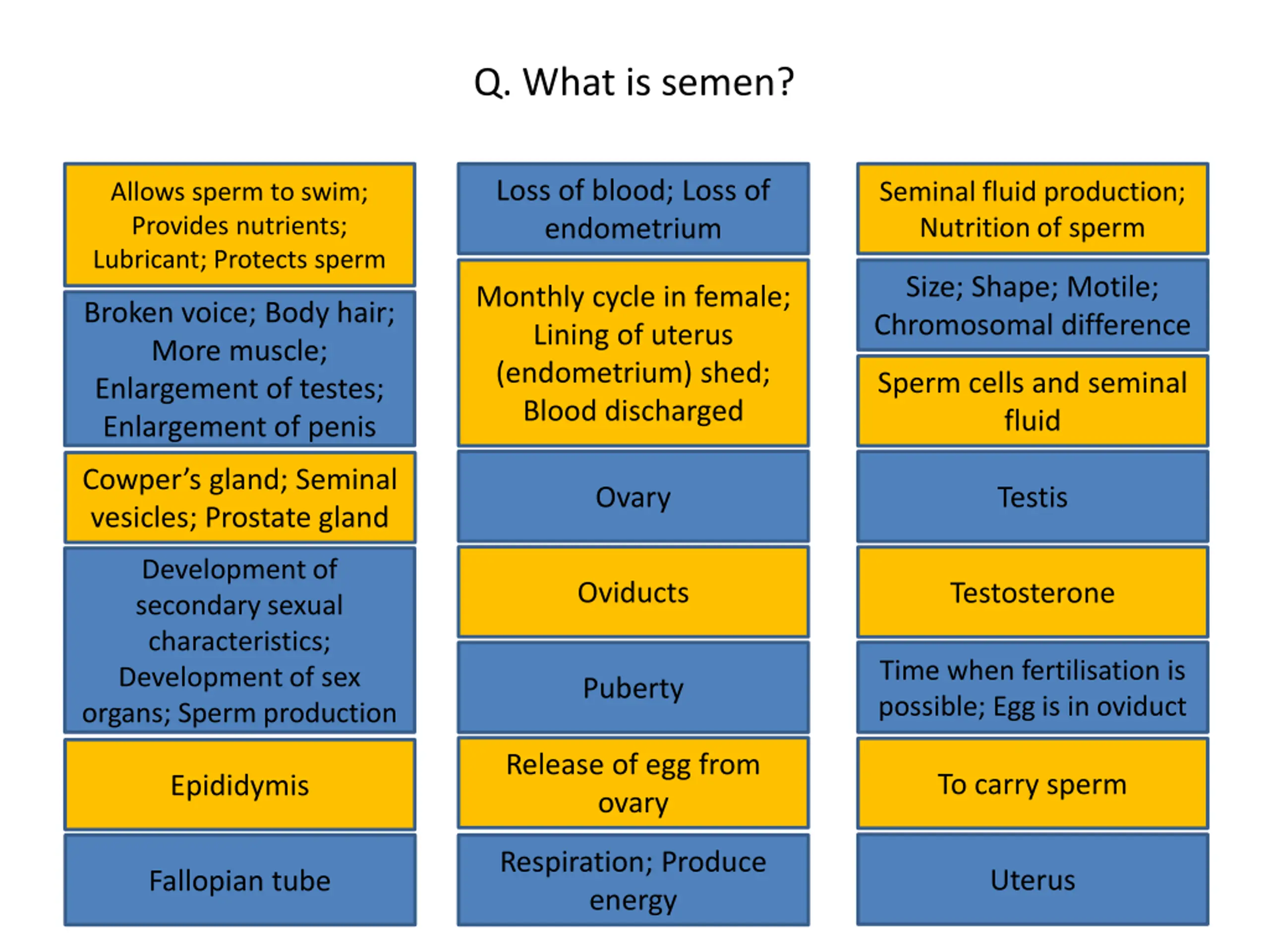 Q. What is semen? Loss of blood; Loss of endometrium Allows sperm to swim; Provides nutrients; Lubricant; Protects sperm Seminal fluid production; Nutrition of sperm Loss of blood; Loss of endometrium Seminal fluid production; Nutrition of sperm Allows sperm to swim; Provides nutrients; Lubricant; Protects sperm Size; Shape; Motile; Chromosomal difference Monthly cycle in female; Lining of uterus (endometrium) shed; Blood discharged Size; Shape; Motile; Chromosomal difference Monthly cycle in female; Lining of uterus (endometrium) shed; Blood discharged Broken voice; Body hair; More muscle; Enlargement of testes; Enlargement of penis Broken voice; Body hair; More muscle; Enlargement of testes; Enlargement of penis Sperm cells and seminal fluid Sperm cells and seminal fluid Ovary Testis Cowper s gland; Seminal vesicles; Prostate gland Cowper s gland; Seminal Ovary Testis Development of secondary sexual characteristics; Development of sex organs; Sperm production vesicles; Prostate gland Oviducts Testosterone Development of secondary sexual characteristics; Development of sex organs; Sperm production Oviducts Testosterone Puberty Time when fertilisation is possible; Egg is in oviduct Time when fertilisation is possible; Egg is in oviduct Puberty Release of egg from ovary To carry sperm Epididymis Release of egg from ovary To carry sperm Epididymis Respiration; Produce energy Uterus Fallopian tube Respiration; Produce energy Uterus Fallopian tube