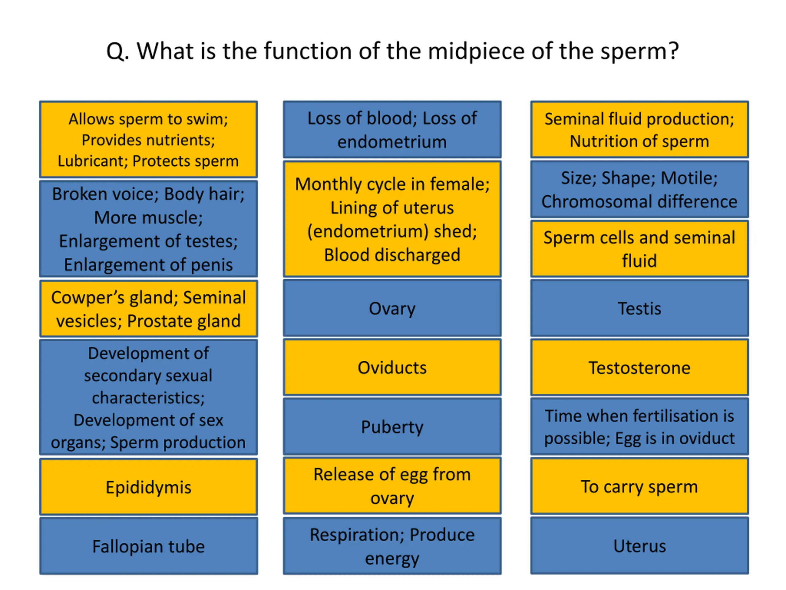Q. What is the function of the midpiece of the sperm? Loss of blood; Loss of endometrium Allows sperm to swim; Provides nutrients; Lubricant; Protects sperm Seminal fluid production; Nutrition of sperm Loss of blood; Loss of endometrium Seminal fluid production; Nutrition of sperm Allows sperm to swim; Provides nutrients; Lubricant; Protects sperm Size; Shape; Motile; Chromosomal difference Monthly cycle in female; Lining of uterus (endometrium) shed; Blood discharged Size; Shape; Motile; Chromosomal difference Monthly cycle in female; Lining of uterus (endometrium) shed; Blood discharged Broken voice; Body hair; More muscle; Enlargement of testes; Enlargement of penis Broken voice; Body hair; More muscle; Enlargement of testes; Enlargement of penis Sperm cells and seminal fluid Sperm cells and seminal fluid Ovary Testis Cowper s gland; Seminal vesicles; Prostate gland Cowper s gland; Seminal Ovary Testis Development of secondary sexual characteristics; Development of sex organs; Sperm production vesicles; Prostate gland Oviducts Testosterone Development of secondary sexual characteristics; Development of sex organs; Sperm production Oviducts Testosterone Puberty Time when fertilisation is possible; Egg is in oviduct Time when fertilisation is possible; Egg is in oviduct Puberty Release of egg from ovary To carry sperm Epididymis Release of egg from ovary To carry sperm Epididymis Respiration; Produce energy Uterus Fallopian tube Respiration; Produce energy Uterus Fallopian tube