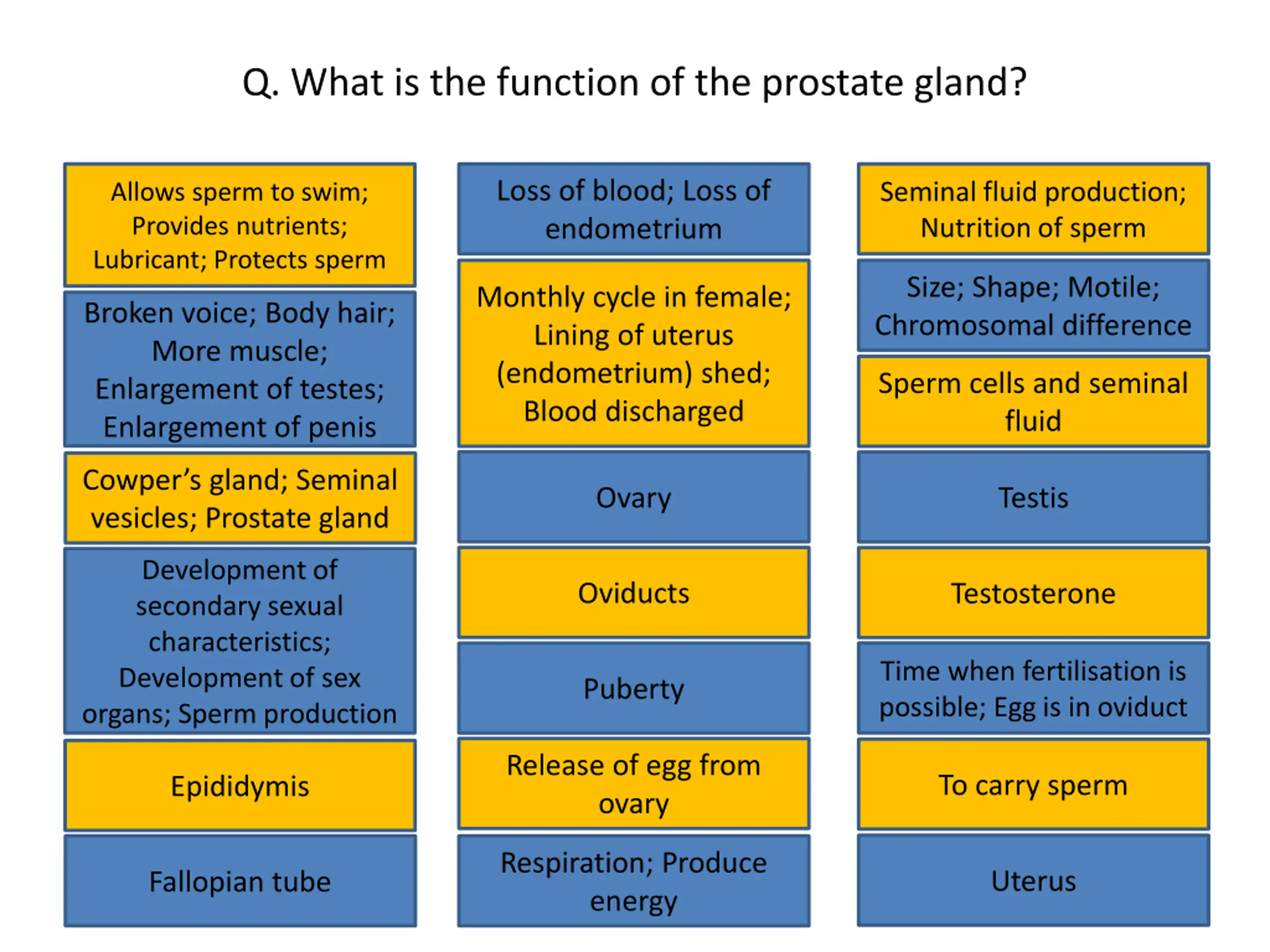 Q. What is the function of the prostate gland? Loss of blood; Loss of endometrium Allows sperm to swim; Provides nutrients; Lubricant; Protects sperm Seminal fluid production; Nutrition of sperm Loss of blood; Loss of endometrium Seminal fluid production; Nutrition of sperm Allows sperm to swim; Provides nutrients; Lubricant; Protects sperm Size; Shape; Motile; Chromosomal difference Monthly cycle in female; Lining of uterus (endometrium) shed; Blood discharged Size; Shape; Motile; Chromosomal difference Monthly cycle in female; Lining of uterus (endometrium) shed; Blood discharged Broken voice; Body hair; More muscle; Enlargement of testes; Enlargement of penis Broken voice; Body hair; More muscle; Enlargement of testes; Enlargement of penis Sperm cells and seminal fluid Sperm cells and seminal fluid Ovary Testis Cowper s gland; Seminal vesicles; Prostate gland Cowper s gland; Seminal Ovary Testis Development of secondary sexual characteristics; Development of sex organs; Sperm production vesicles; Prostate gland Oviducts Testosterone Development of secondary sexual characteristics; Development of sex organs; Sperm production Oviducts Testosterone Puberty Time when fertilisation is possible; Egg is in oviduct Time when fertilisation is possible; Egg is in oviduct Puberty Release of egg from ovary To carry sperm Epididymis Release of egg from ovary To carry sperm Epididymis Respiration; Produce energy Uterus Fallopian tube Respiration; Produce energy Uterus Fallopian tube