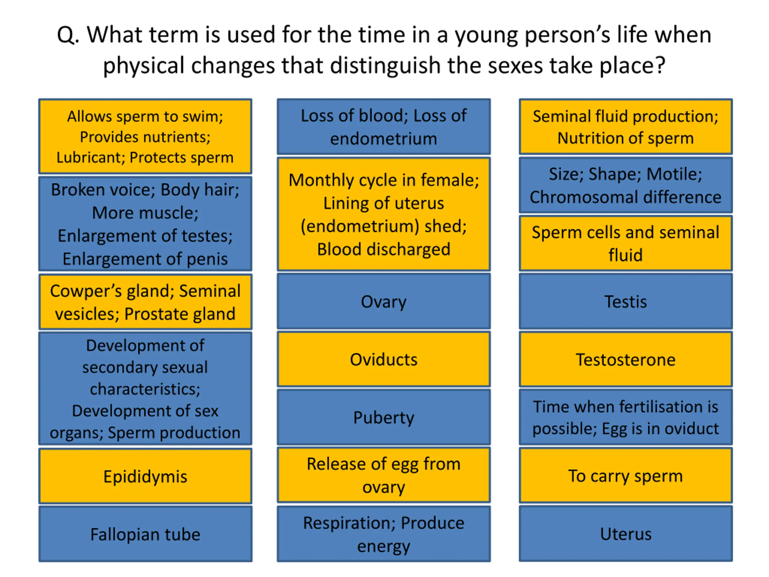 Q. What term is used for the time in a young persons life when physical changes that distinguish the sexes take place? Loss of blood; Loss of endometrium Allows sperm to swim; Provides nutrients; Lubricant; Protects sperm Seminal fluid production; Nutrition of sperm Loss of blood; Loss of endometrium Seminal fluid production; Nutrition of sperm Allows sperm to swim; Provides nutrients; Lubricant; Protects sperm Size; Shape; Motile; Chromosomal difference Monthly cycle in female; Lining of uterus (endometrium) shed; Blood discharged Size; Shape; Motile; Chromosomal difference Monthly cycle in female; Lining of uterus (endometrium) shed; Blood discharged Broken voice; Body hair; More muscle; Enlargement of testes; Enlargement of penis Broken voice; Body hair; More muscle; Enlargement of testes; Enlargement of penis Sperm cells and seminal fluid Sperm cells and seminal fluid Ovary Testis Cowper s gland; Seminal vesicles; Prostate gland Cowper s gland; Seminal Ovary Testis Development of secondary sexual characteristics; Development of sex organs; Sperm production vesicles; Prostate gland Oviducts Testosterone Development of secondary sexual characteristics; Development of sex organs; Sperm production Oviducts Testosterone Puberty Time when fertilisation is possible; Egg is in oviduct Time when fertilisation is possible; Egg is in oviduct Puberty Release of egg from ovary To carry sperm Epididymis Release of egg from ovary To carry sperm Epididymis Respiration; Produce energy Uterus Fallopian tube Respiration; Produce energy Uterus Fallopian tube