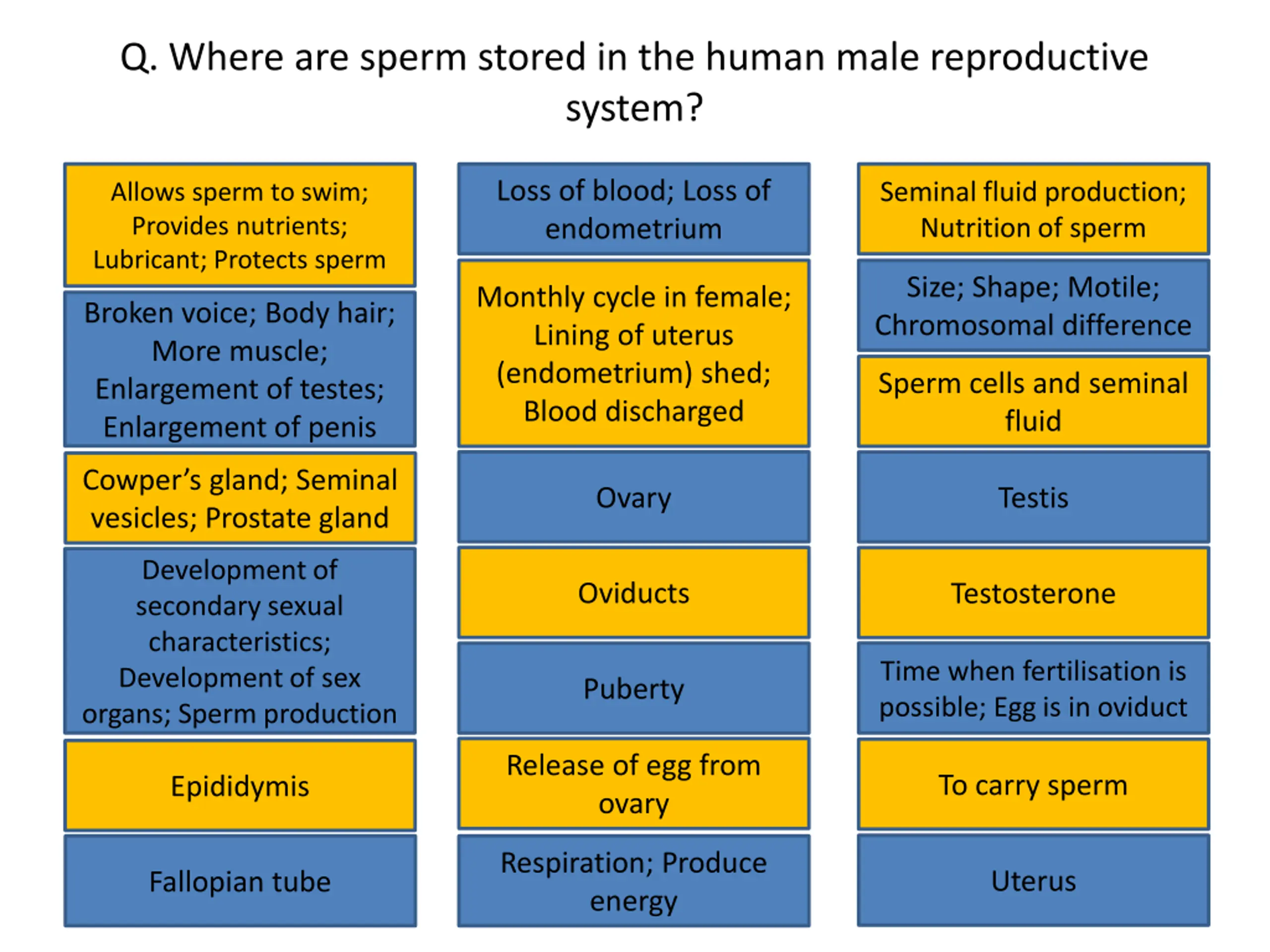 Q. Where are sperm stored in the human male reproductive system? Loss of blood; Loss of endometrium Allows sperm to swim; Provides nutrients; Lubricant; Protects sperm Seminal fluid production; Nutrition of sperm Loss of blood; Loss of endometrium Seminal fluid production; Nutrition of sperm Allows sperm to swim; Provides nutrients; Lubricant; Protects sperm Size; Shape; Motile; Chromosomal difference Monthly cycle in female; Lining of uterus (endometrium) shed; Blood discharged Size; Shape; Motile; Chromosomal difference Monthly cycle in female; Lining of uterus (endometrium) shed; Blood discharged Broken voice; Body hair; More muscle; Enlargement of testes; Enlargement of penis Broken voice; Body hair; More muscle; Enlargement of testes; Enlargement of penis Sperm cells and seminal fluid Sperm cells and seminal fluid Ovary Testis Cowper s gland; Seminal vesicles; Prostate gland Cowper s gland; Seminal Ovary Testis Development of secondary sexual characteristics; Development of sex organs; Sperm production vesicles; Prostate gland Oviducts Testosterone Development of secondary sexual characteristics; Development of sex organs; Sperm production Oviducts Testosterone Puberty Time when fertilisation is possible; Egg is in oviduct Time when fertilisation is possible; Egg is in oviduct Puberty Release of egg from ovary To carry sperm Epididymis Release of egg from ovary To carry sperm Epididymis Respiration; Produce energy Uterus Fallopian tube Respiration; Produce energy Uterus Fallopian tube