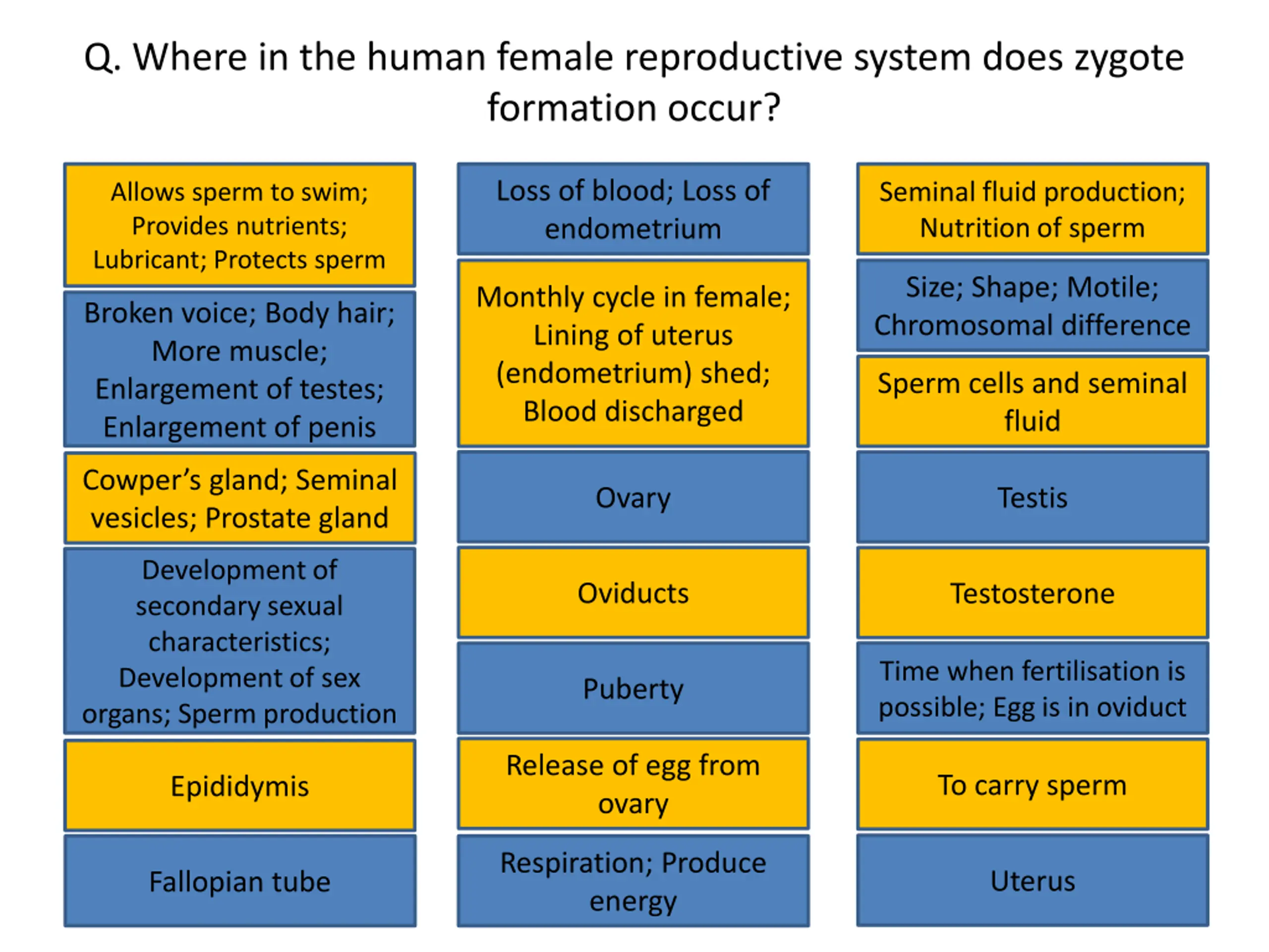 Q. Where in the human female reproductive system does zygote formation occur? Loss of blood; Loss of endometrium Allows sperm to swim; Provides nutrients; Lubricant; Protects sperm Seminal fluid production; Nutrition of sperm Loss of blood; Loss of endometrium Seminal fluid production; Nutrition of sperm Allows sperm to swim; Provides nutrients; Lubricant; Protects sperm Size; Shape; Motile; Chromosomal difference Monthly cycle in female; Lining of uterus (endometrium) shed; Blood discharged Size; Shape; Motile; Chromosomal difference Monthly cycle in female; Lining of uterus (endometrium) shed; Blood discharged Broken voice; Body hair; More muscle; Enlargement of testes; Enlargement of penis Broken voice; Body hair; More muscle; Enlargement of testes; Enlargement of penis Sperm cells and seminal fluid Sperm cells and seminal fluid Ovary Testis Cowper s gland; Seminal vesicles; Prostate gland Cowper s gland; Seminal Ovary Testis Development of secondary sexual characteristics; Development of sex organs; Sperm production vesicles; Prostate gland Oviducts Testosterone Development of secondary sexual characteristics; Development of sex organs; Sperm production Oviducts Testosterone Puberty Time when fertilisation is possible; Egg is in oviduct Time when fertilisation is possible; Egg is in oviduct Puberty Release of egg from ovary To carry sperm Epididymis Release of egg from ovary To carry sperm Epididymis Respiration; Produce energy Uterus Fallopian tube Respiration; Produce energy Uterus Fallopian tube