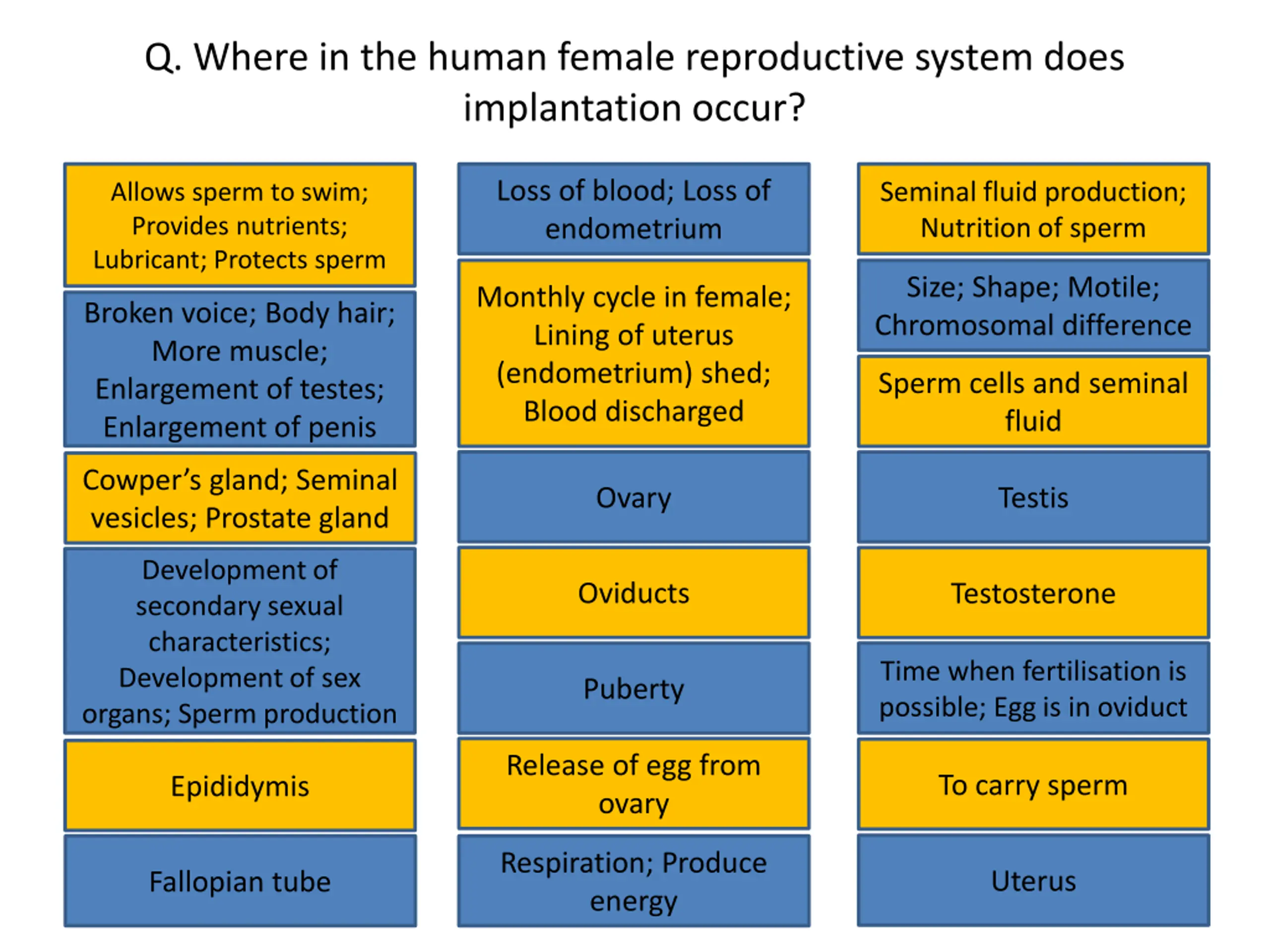 Q. Where in the human female reproductive system does implantation occur? Loss of blood; Loss of endometrium Allows sperm to swim; Provides nutrients; Lubricant; Protects sperm Seminal fluid production; Nutrition of sperm Loss of blood; Loss of endometrium Seminal fluid production; Nutrition of sperm Allows sperm to swim; Provides nutrients; Lubricant; Protects sperm Size; Shape; Motile; Chromosomal difference Monthly cycle in female; Lining of uterus (endometrium) shed; Blood discharged Size; Shape; Motile; Chromosomal difference Monthly cycle in female; Lining of uterus (endometrium) shed; Blood discharged Broken voice; Body hair; More muscle; Enlargement of testes; Enlargement of penis Broken voice; Body hair; More muscle; Enlargement of testes; Enlargement of penis Sperm cells and seminal fluid Sperm cells and seminal fluid Ovary Testis Cowper s gland; Seminal vesicles; Prostate gland Cowper s gland; Seminal Ovary Testis Development of secondary sexual characteristics; Development of sex organs; Sperm production vesicles; Prostate gland Oviducts Testosterone Development of secondary sexual characteristics; Development of sex organs; Sperm production Oviducts Testosterone Puberty Time when fertilisation is possible; Egg is in oviduct Time when fertilisation is possible; Egg is in oviduct Puberty Release of egg from ovary To carry sperm Epididymis Release of egg from ovary To carry sperm Epididymis Respiration; Produce energy Uterus Fallopian tube Respiration; Produce energy Uterus Fallopian tube