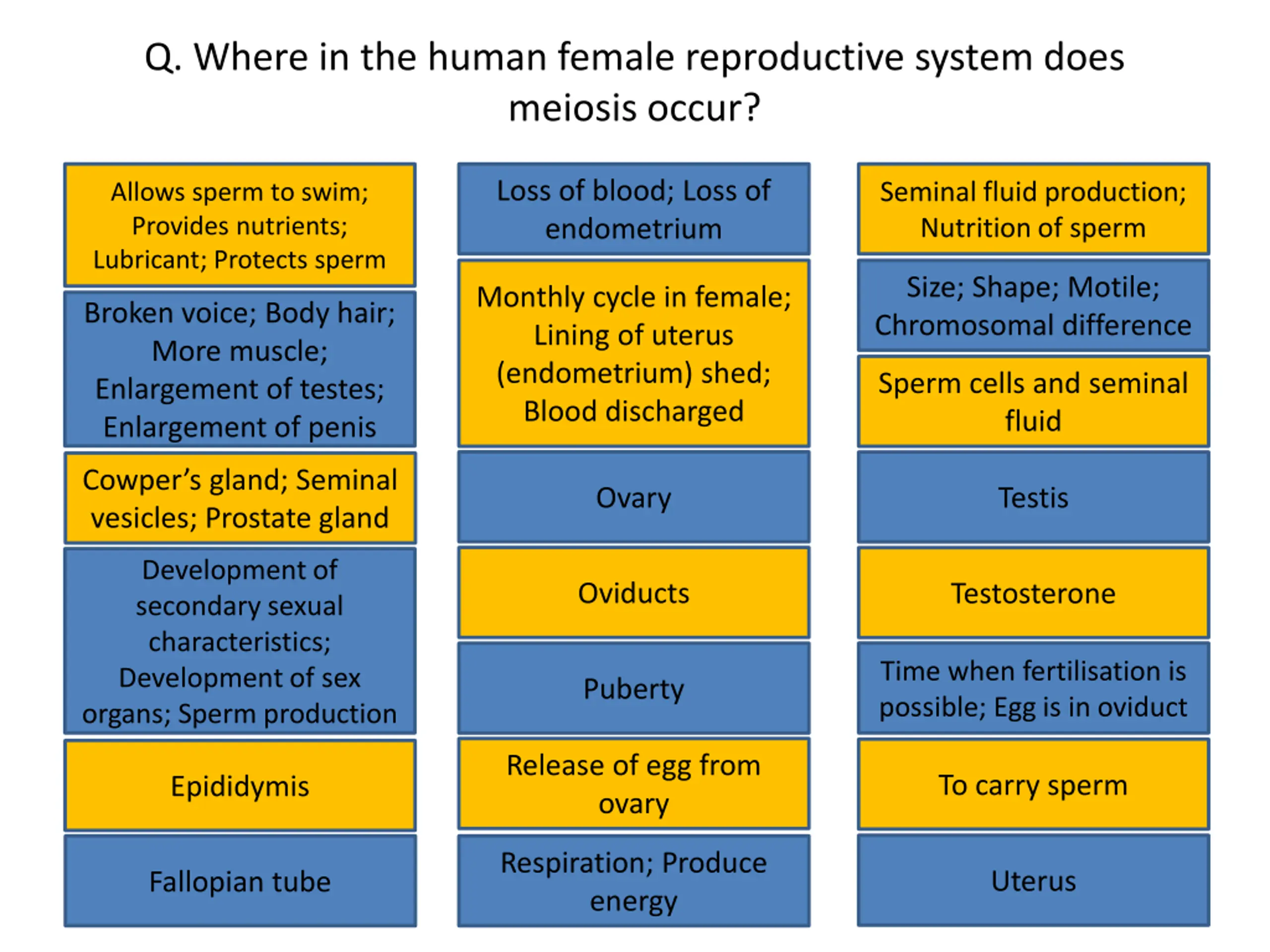 Q. Where in the human female reproductive system does meiosis occur? Loss of blood; Loss of endometrium Allows sperm to swim; Provides nutrients; Lubricant; Protects sperm Seminal fluid production; Nutrition of sperm Loss of blood; Loss of endometrium Seminal fluid production; Nutrition of sperm Allows sperm to swim; Provides nutrients; Lubricant; Protects sperm Size; Shape; Motile; Chromosomal difference Monthly cycle in female; Lining of uterus (endometrium) shed; Blood discharged Size; Shape; Motile; Chromosomal difference Monthly cycle in female; Lining of uterus (endometrium) shed; Blood discharged Broken voice; Body hair; More muscle; Enlargement of testes; Enlargement of penis Broken voice; Body hair; More muscle; Enlargement of testes; Enlargement of penis Sperm cells and seminal fluid Sperm cells and seminal fluid Ovary Testis Cowper s gland; Seminal vesicles; Prostate gland Cowper s gland; Seminal Ovary Testis Development of secondary sexual characteristics; Development of sex organs; Sperm production vesicles; Prostate gland Oviducts Testosterone Development of secondary sexual characteristics; Development of sex organs; Sperm production Oviducts Testosterone Puberty Time when fertilisation is possible; Egg is in oviduct Time when fertilisation is possible; Egg is in oviduct Puberty Release of egg from ovary To carry sperm Epididymis Release of egg from ovary To carry sperm Epididymis Respiration; Produce energy Uterus Fallopian tube Respiration; Produce energy Uterus Fallopian tube