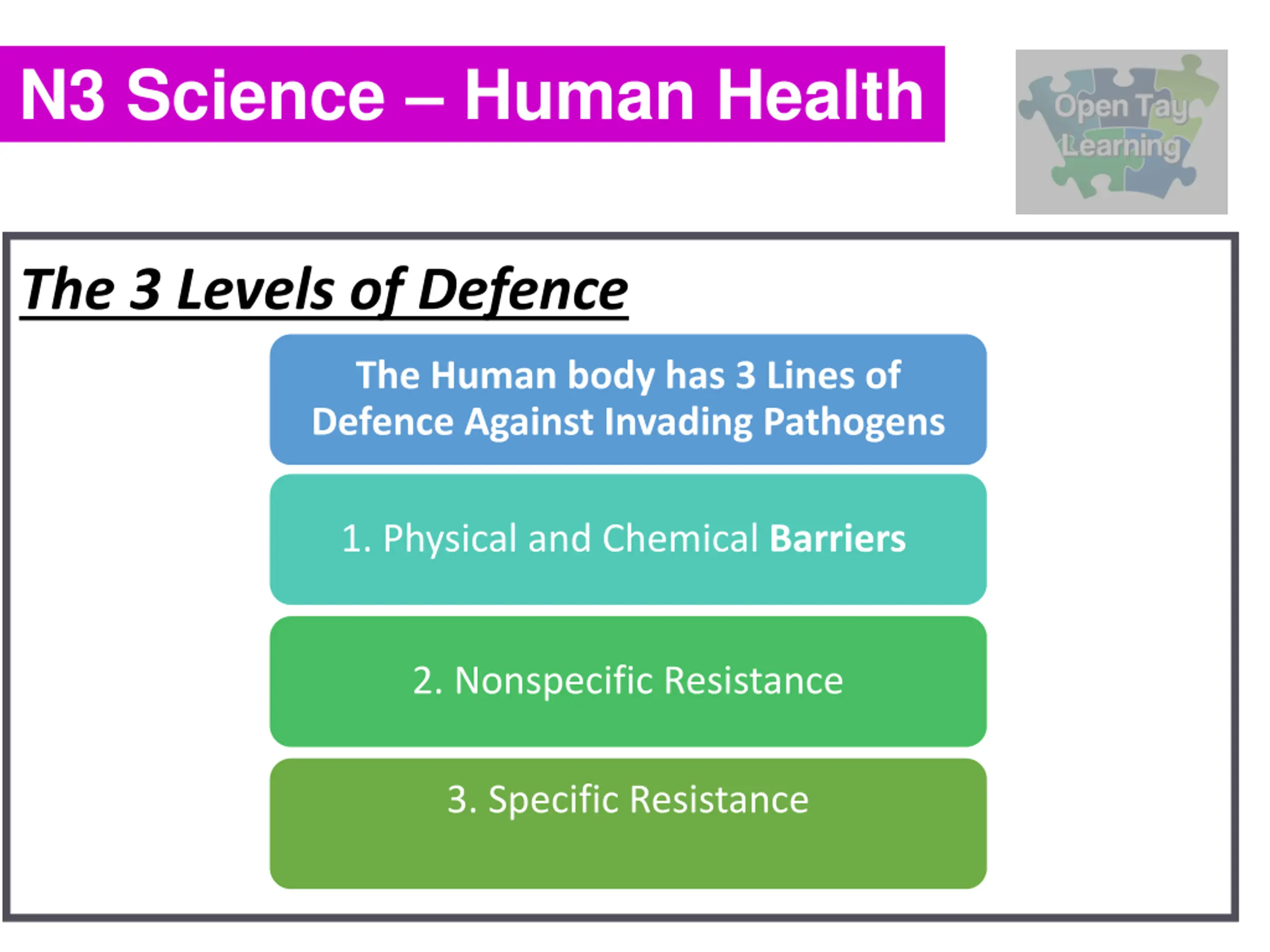 N3 Science Human Health The 3 Levels of Defence The Human body has 3 Lines of Defence Against Invading Pathogens 1. Physical and Chemical Barriers 2. Nonspecific Resistance 3. Specific Resistance