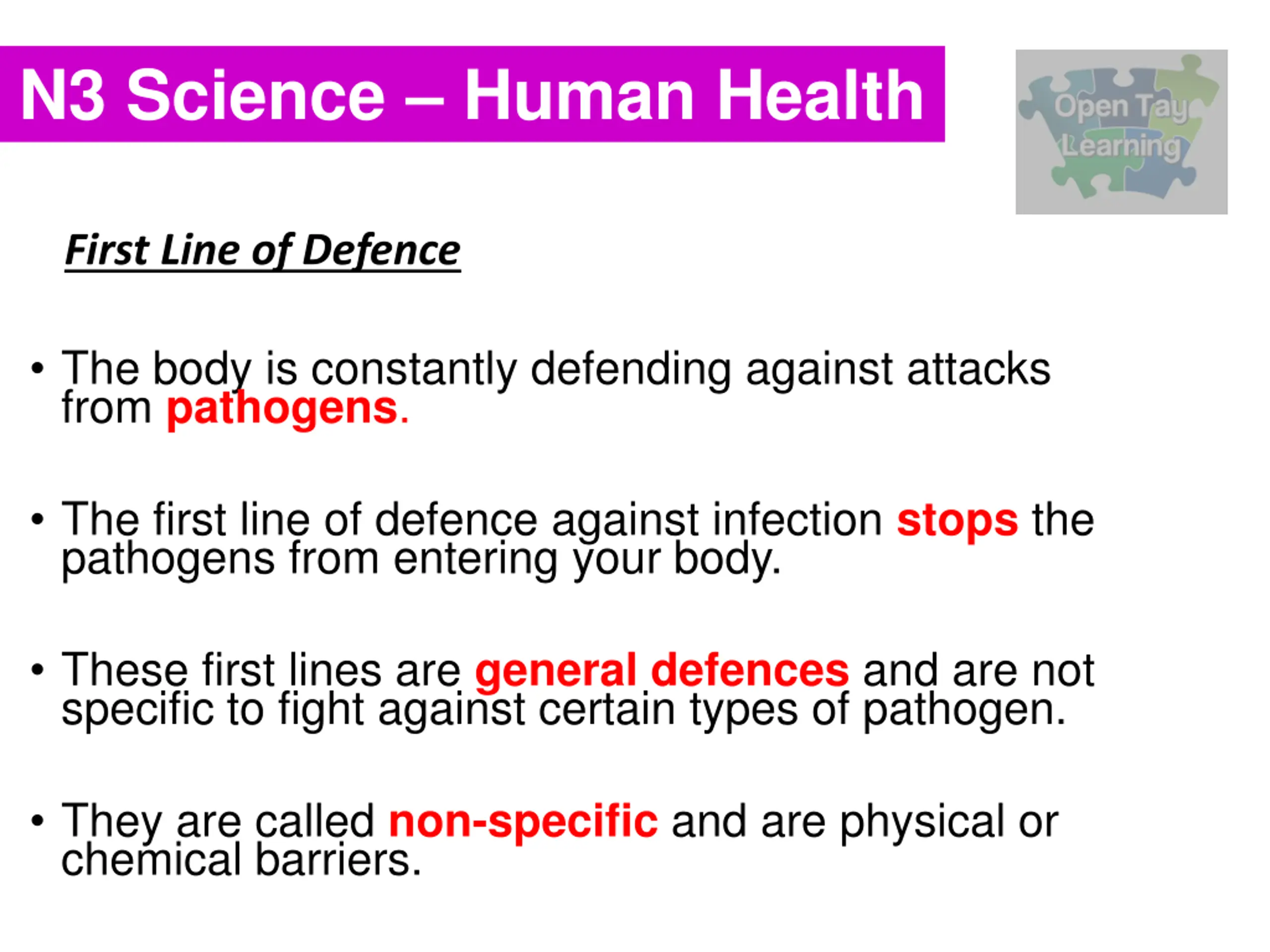 N3 Science Human Health First Line of Defence The body is constantly defending against attacks from pathogens. The first line of defence against infection stops the pathogens from entering your body. These first lines are general defences and are not specific to fight against certain types of pathogen. They are called non-specific and are physical or chemical barriers.
