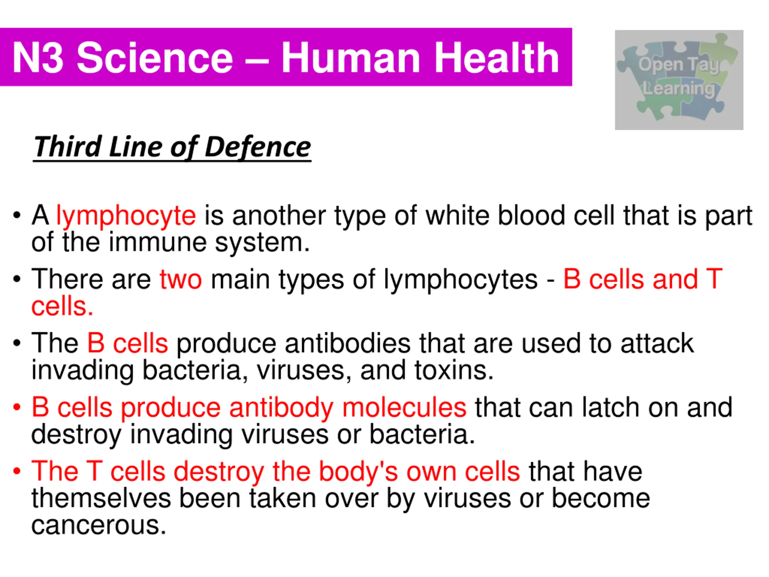 N3 Science Human Health Third Line of Defence A lymphocyte is another type of white blood cell that is part of the immune system. There are two main types of lymphocytes - B cells and T cells. The B cells produce antibodies that are used to attack invading bacteria, viruses, and toxins. B cells produce antibody molecules that can latch on and destroy invading viruses or bacteria. The T cells destroy the body's own cells that have themselves been taken over by viruses or become cancerous.