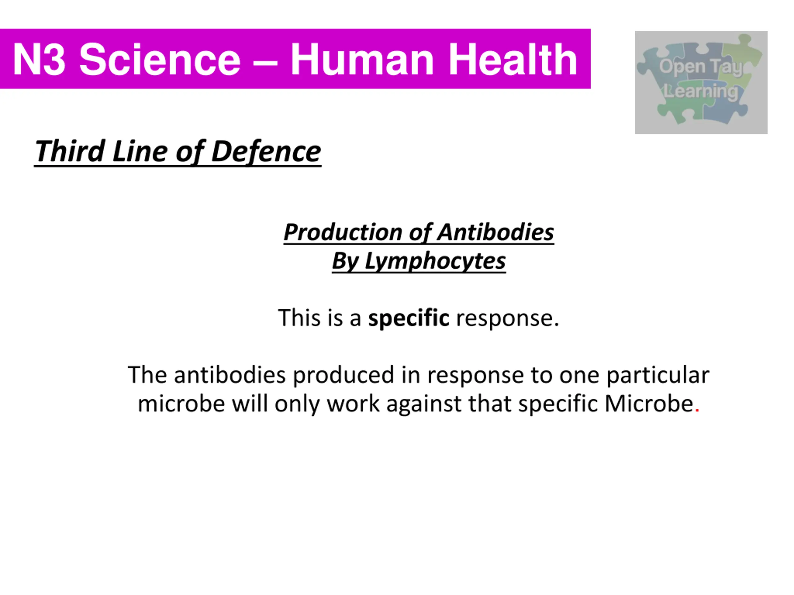 N3 Science Human Health Third Line of Defence Production of Antibodies By Lymphocytes This is a specific response. The antibodies produced in response to one particular microbe will only work against that specific Microbe.