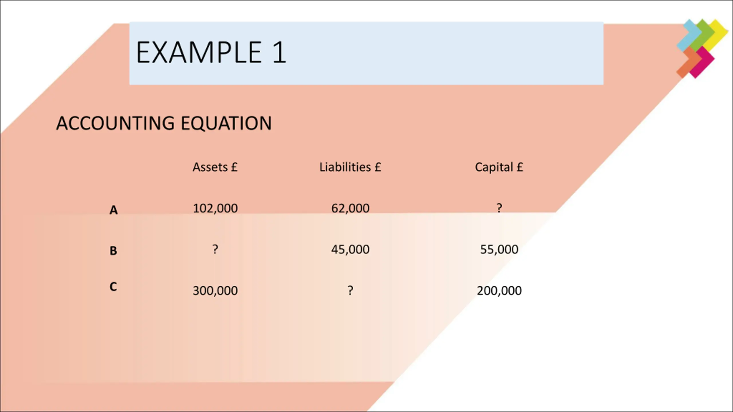 EXAMPLE 1 ACCOUNTING EQUATION Assets Liabilities Capital 102,000 62,000 ? A ? 45,000 55,000 B C 300,000 ? 200,000