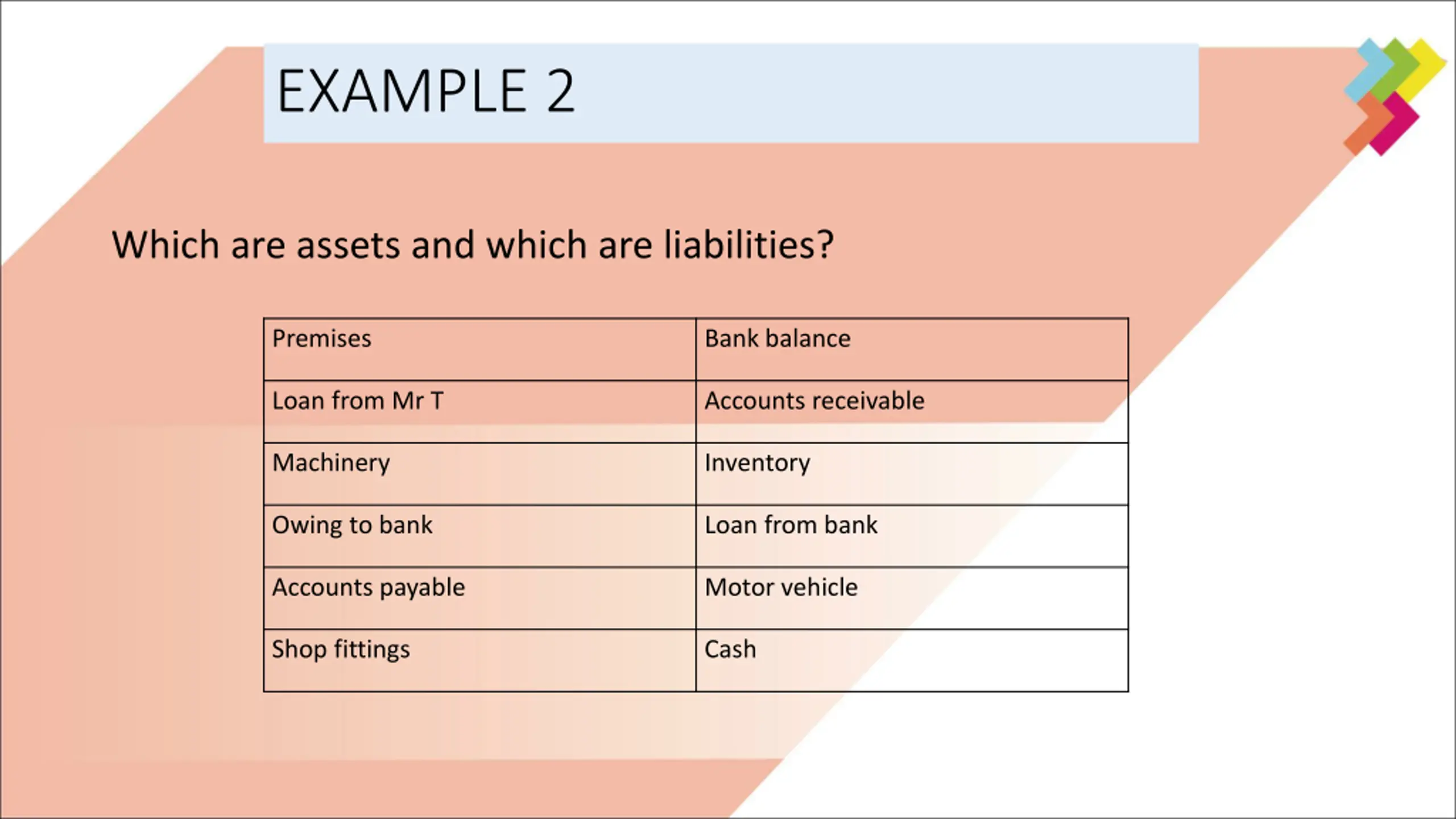 EXAMPLE 2 Which are assets and which are liabilities? Premises Bank balance Loan from Mr T Accounts receivable Machinery Inventory Owing to bank Loan from bank Accounts payable Motor vehicle Shop fittings Cash