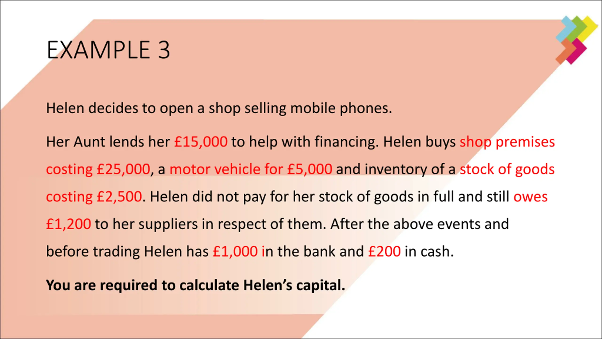 EXAMPLE 3 Helen decides to open a shop selling mobile phones. Her Aunt lends her 15,000 to help with financing. Helen buys shop premises costing 25,000, a motor vehicle for 5,000 and inventory of a stock of goods costing 2,500. Helen did not pay for her stock of goods in full and still owes 1,200 to her suppliers in respect of them. After the above events and before trading Helen has 1,000 in the bank and 200 in cash. You are required to calculate Helen s capital.