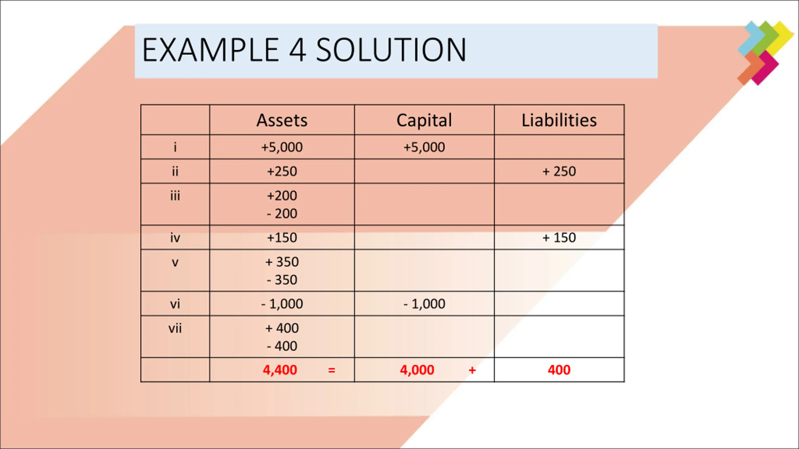 EXAMPLE 4 SOLUTION Assets Capital Liabilities i +5,000 +5,000 ii +250 + 250 iii +200 - 200 iv +150 + 150 v + 350 - 350 vi - 1,000 - 1,000 vii + 400 - 400 4,400 = 4,000 + 400
