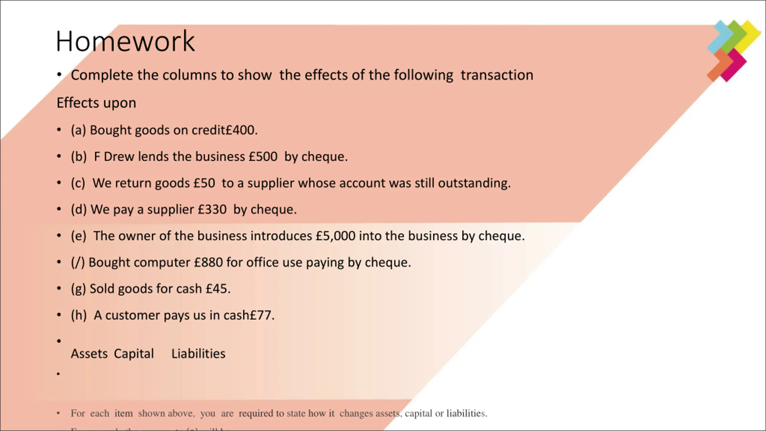 Homework Complete the columns to show the effects of the following transaction Effects upon (a) Bought goods on credit 400. (b) F Drew lends the business 500 by cheque. (c) We return goods 50 to a supplier whose account was still outstanding. (d) We pay a supplier 330 by cheque. (e) The owner of the business introduces 5,000 into the business by cheque. (/) Bought computer 880 for office use paying by cheque. (g) Sold goods for cash 45. (h) A customer pays us in cash 77. Assets Capital Liabilities For each item shown above, you are required to state how it changes assets, capital or liabilities. For example the answer to (a) will be: