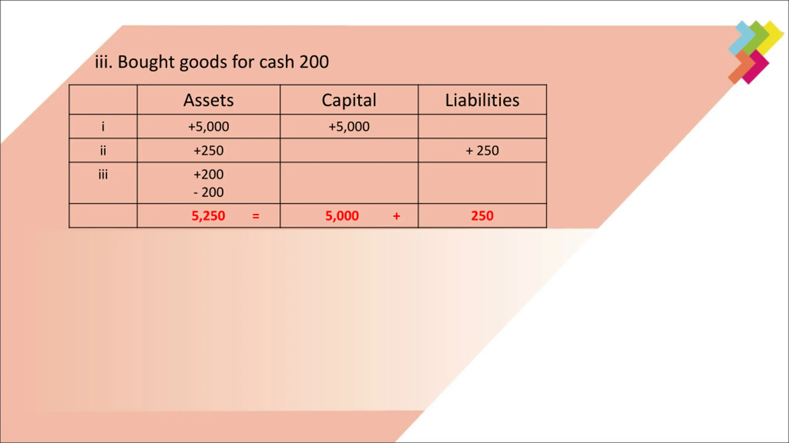 iii. Bought goods for cash 200 Assets Capital Liabilities i +5,000 +5,000 ii +250 + 250 iii +200 - 200 5,250 = 5,000 + 250