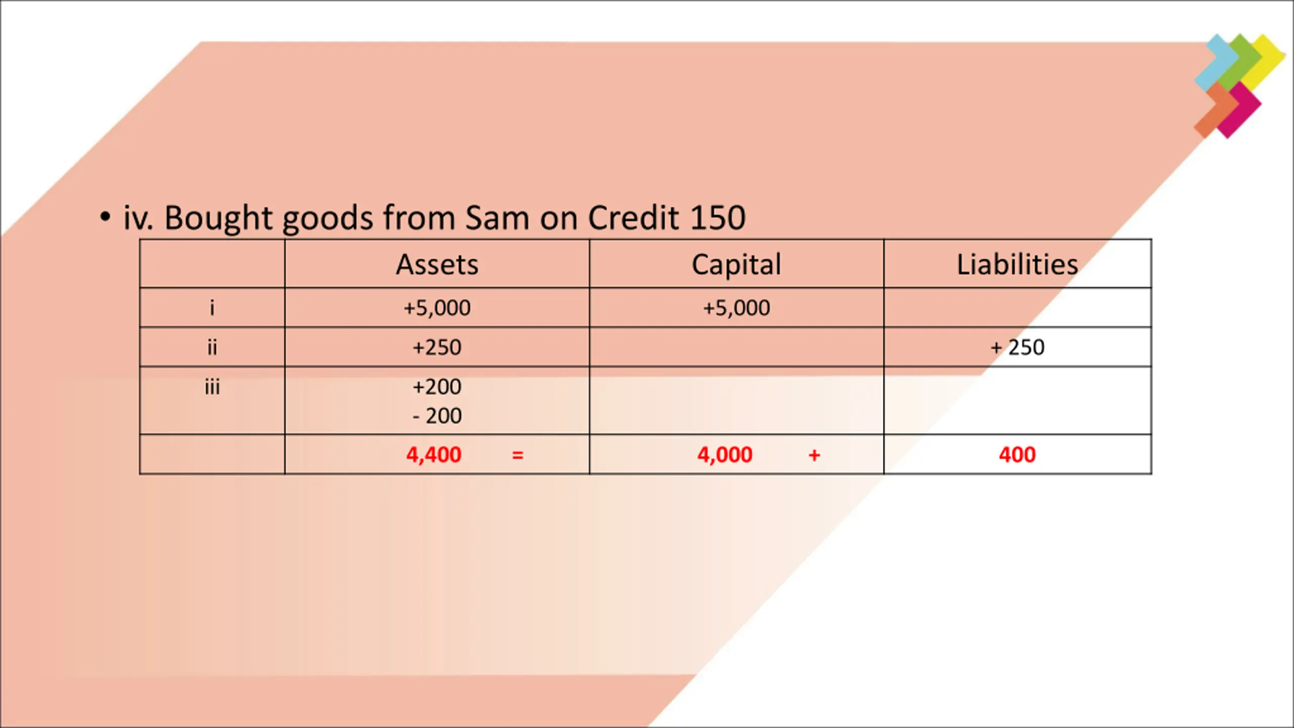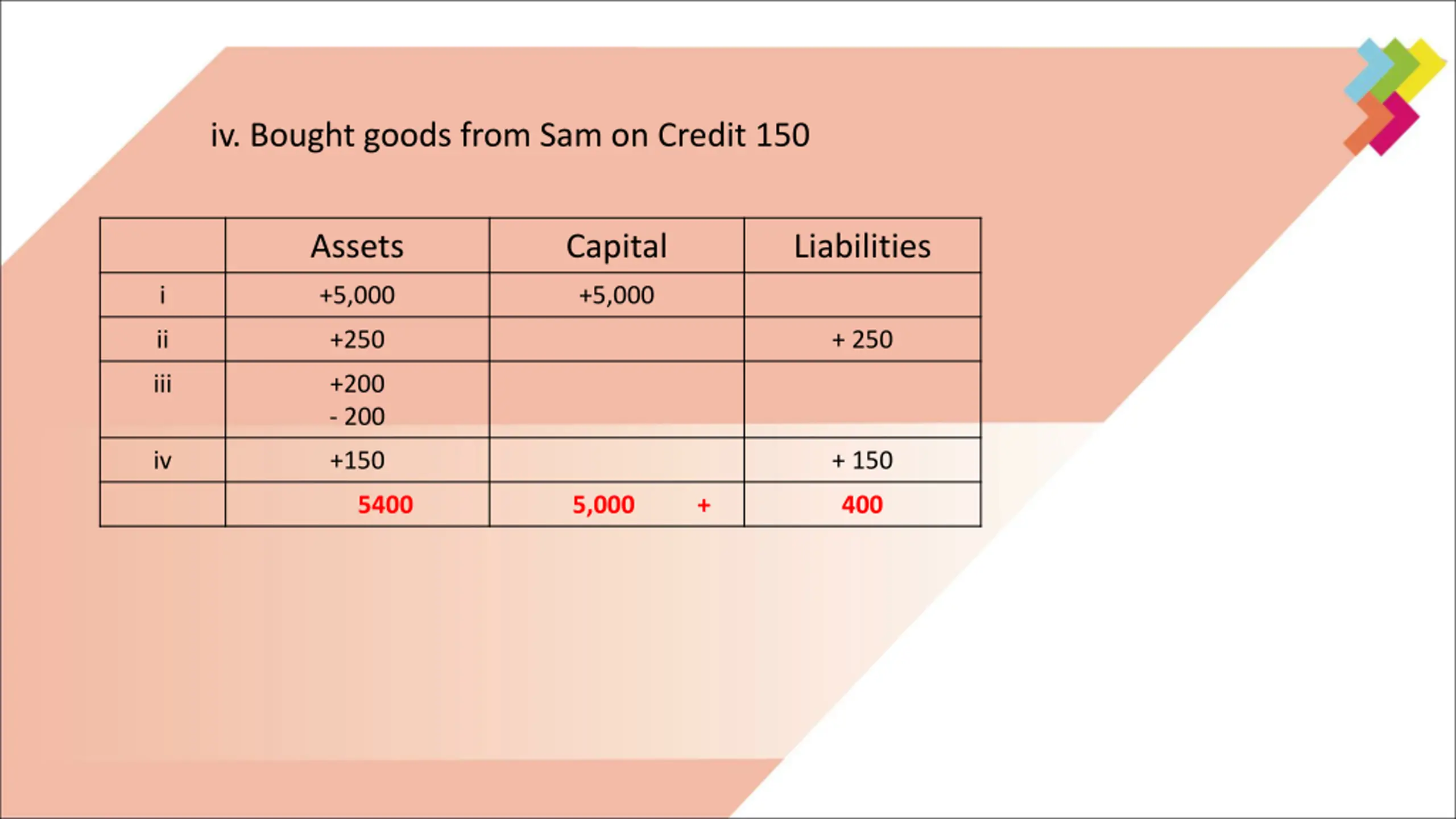 iv. Bought goods from Sam on Credit 150 Assets Capital Liabilities i +5,000 +5,000 ii +250 + 250 iii +200 - 200 iv +150 + 150 5400 5,000 + 400