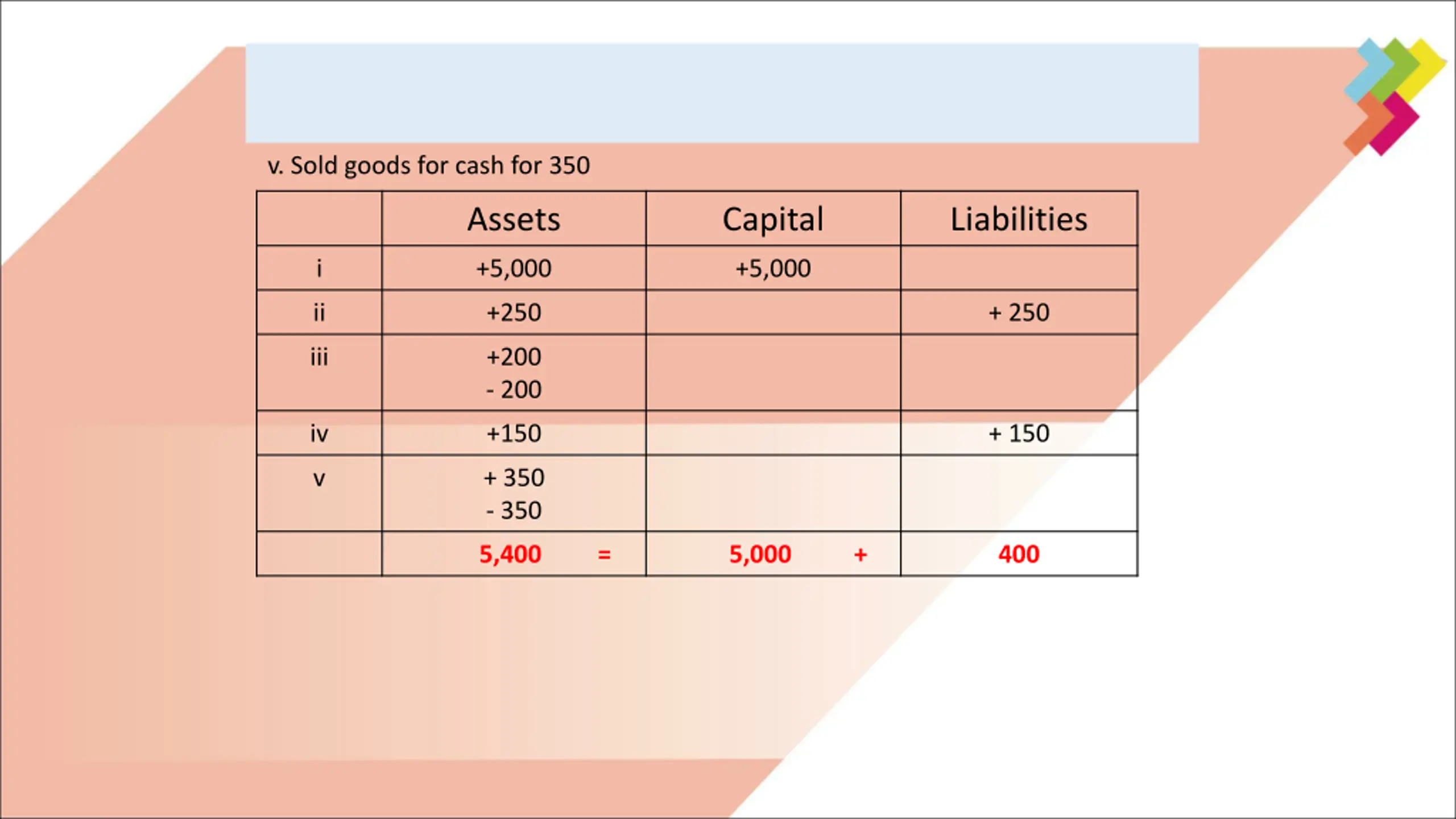 v. Sold goods for cash for 350 Assets Capital Liabilities i +5,000 +5,000 ii +250 + 250 iii +200 - 200 iv +150 + 150 v + 350 - 350 5,400 = 5,000 + 400
