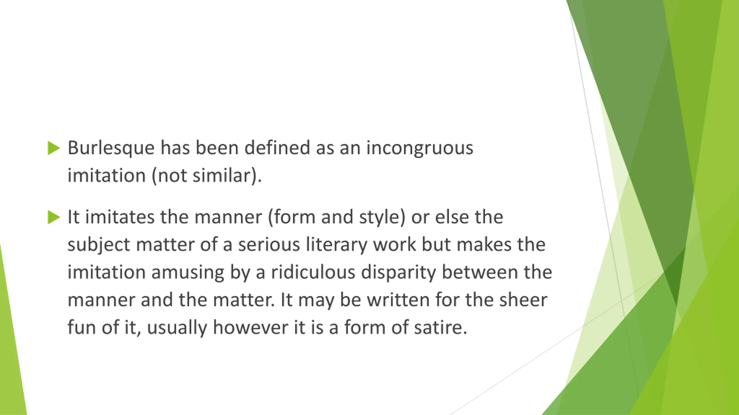 Burlesque has been defined as an incongruous imitation (not similar). It imitates the manner (form and style) or else the subject matter of a serious literary work but makes the imitation amusing by a ridiculous disparity between the manner and the matter. It may be written for the sheer fun of it, usually however it is a form of satire.