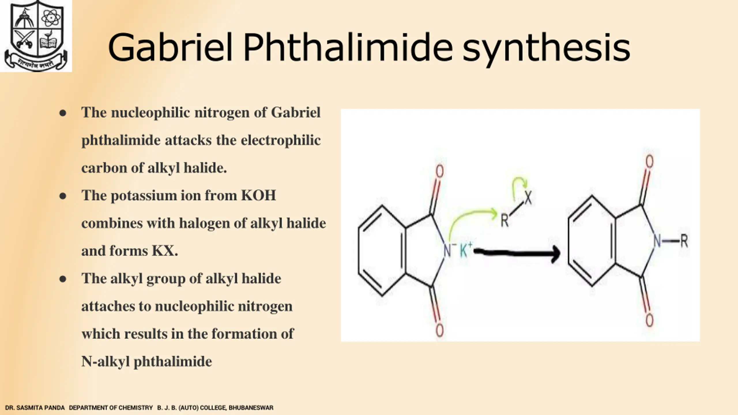 Gabriel Phthalimide synthesis The nucleophilic nitrogen of Gabriel phthalimide attacks the electrophilic carbon of alkyl halide. The potassium ion from KOH combines with halogen of alkyl halide and forms KX. The alkyl group of alkyl halide attaches to nucleophilic nitrogen which results in the formation of N-alkyl phthalimide DR. SASMITA PANDA DEPARTMENT OF CHEMISTRY B. J. B. (AUTO) COLLEGE, BHUBANESWAR