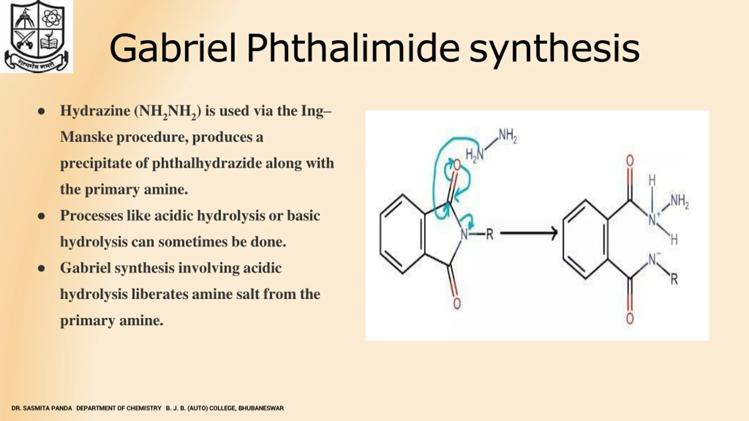 Gabriel Phthalimide synthesis Unreacted NH2 group of hydrazine undergoes nucleophilic acyl substitution and attacks the carbonyl group liberating amine. DR. SASMITA PANDA DEPARTMENT OF CHEMISTRY B. J. B. (AUTO) COLLEGE, BHUBANESWAR