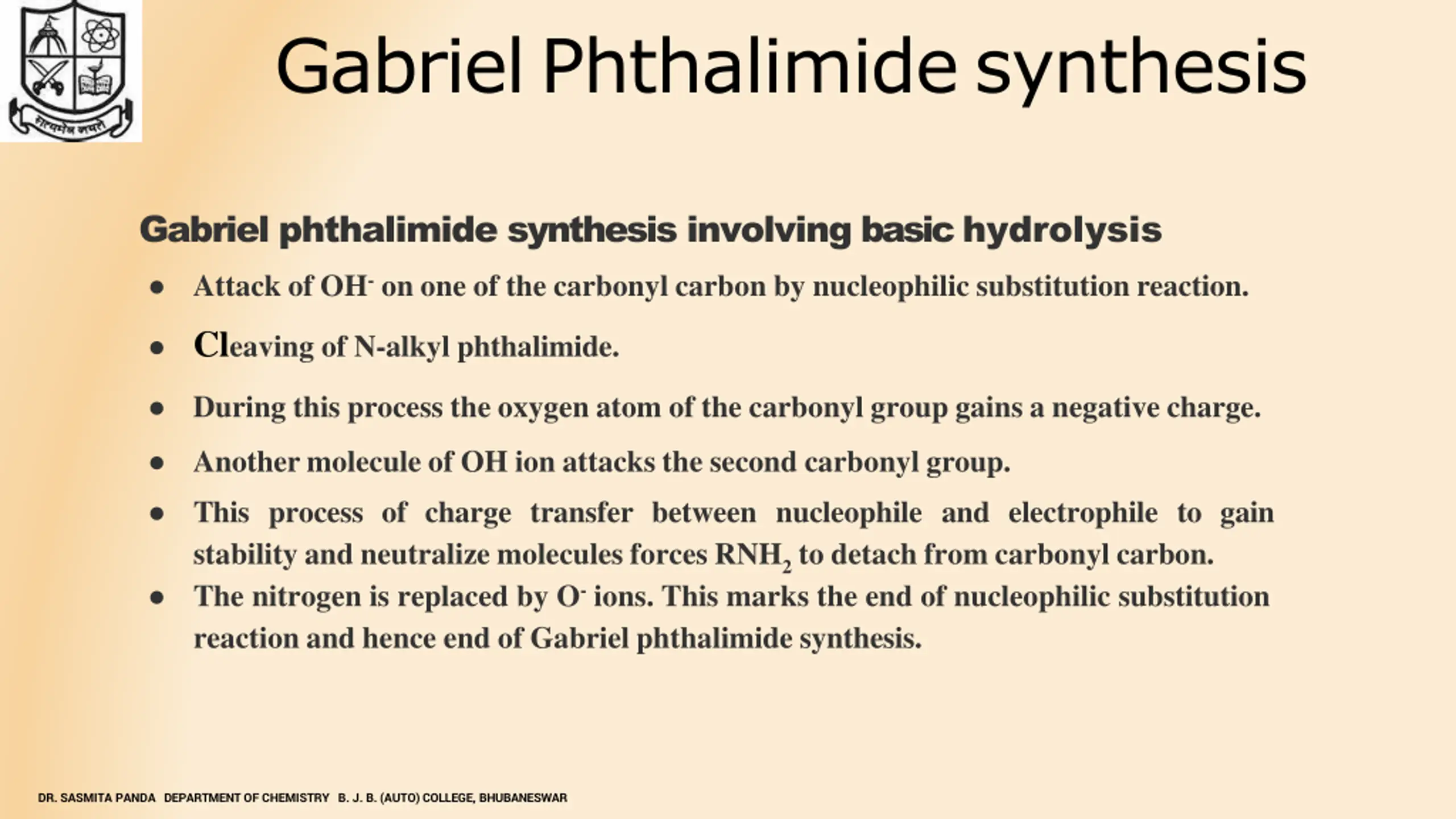 Gabriel Phthalimide synthesis Gabriel phthalimide synthesis involving basic hydrolysis Attack of OH- on one of the carbonyl carbon by nucleophilic substitution reaction. Cleaving of N-alkyl phthalimide. During this process the oxygen atom of the carbonyl group gains a negative charge. Another molecule of OH ion attacks the second carbonyl group. This process of charge transfer between nucleophile and electrophile to gain stability and neutralize molecules forces RNH2 to detach from carbonyl carbon. The nitrogen is replaced by O- ions. This marks the end of nucleophilic substitution reaction and hence end of Gabriel phthalimide synthesis. DR. SASMITA PANDA DEPARTMENT OF CHEMISTRY B. J. B. (AUTO) COLLEGE, BHUBANESWAR