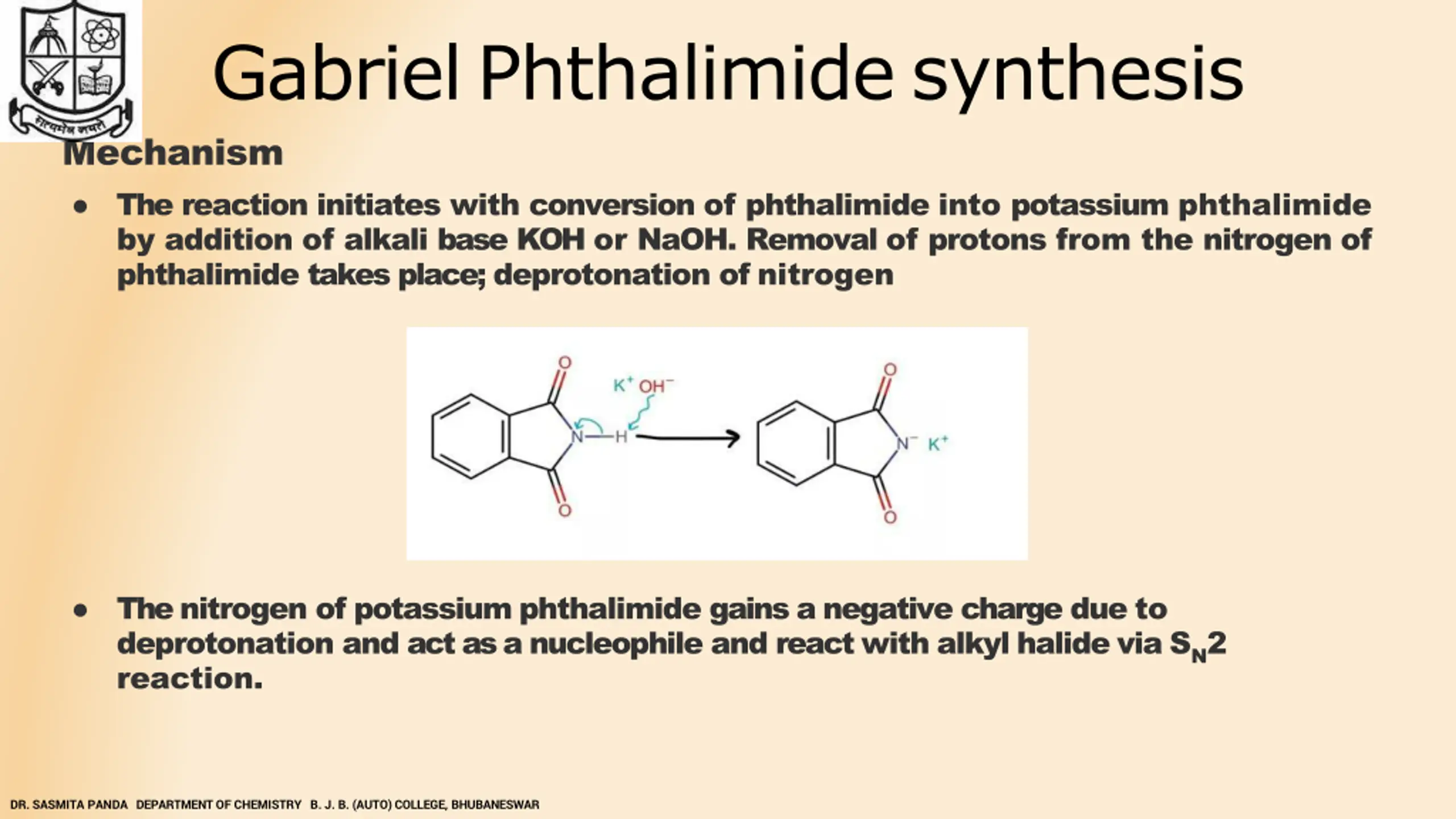 Gabriel Phthalimide synthesis Mechanism The reaction initiates with conversion of phthalimide into potassium phthalimide by addition of alkali base KOH or NaOH. Removal of protons from the nitrogen of phthalimide takes place; deprotonation of nitrogen The nitrogen of potassium phthalimide gains a negative charge due to deprotonation and act as a nucleophile and react with alkyl halide via SN2 reaction. DR. SASMITA PANDA DEPARTMENT OF CHEMISTRY B. J. B. (AUTO) COLLEGE, BHUBANESWAR